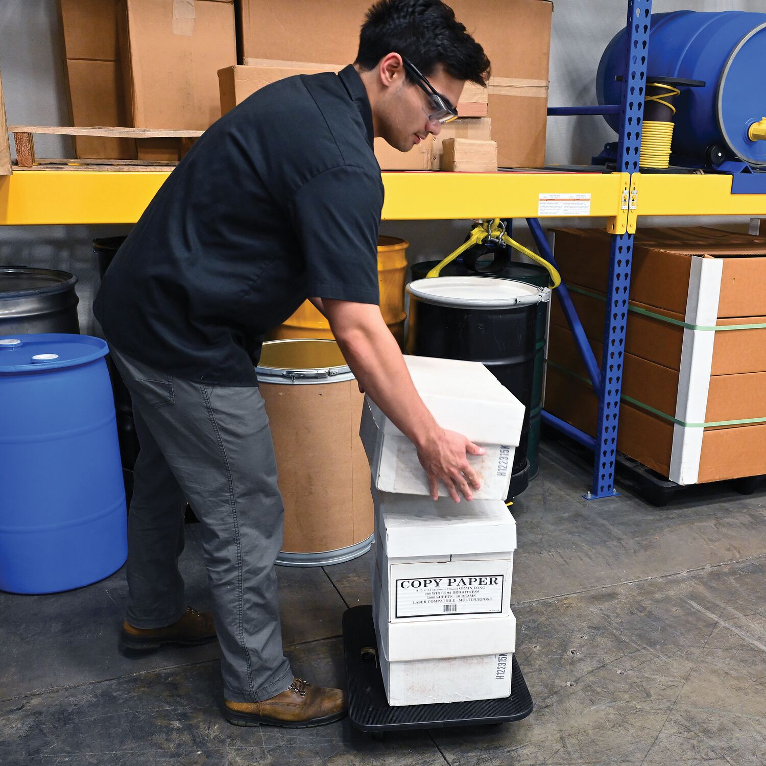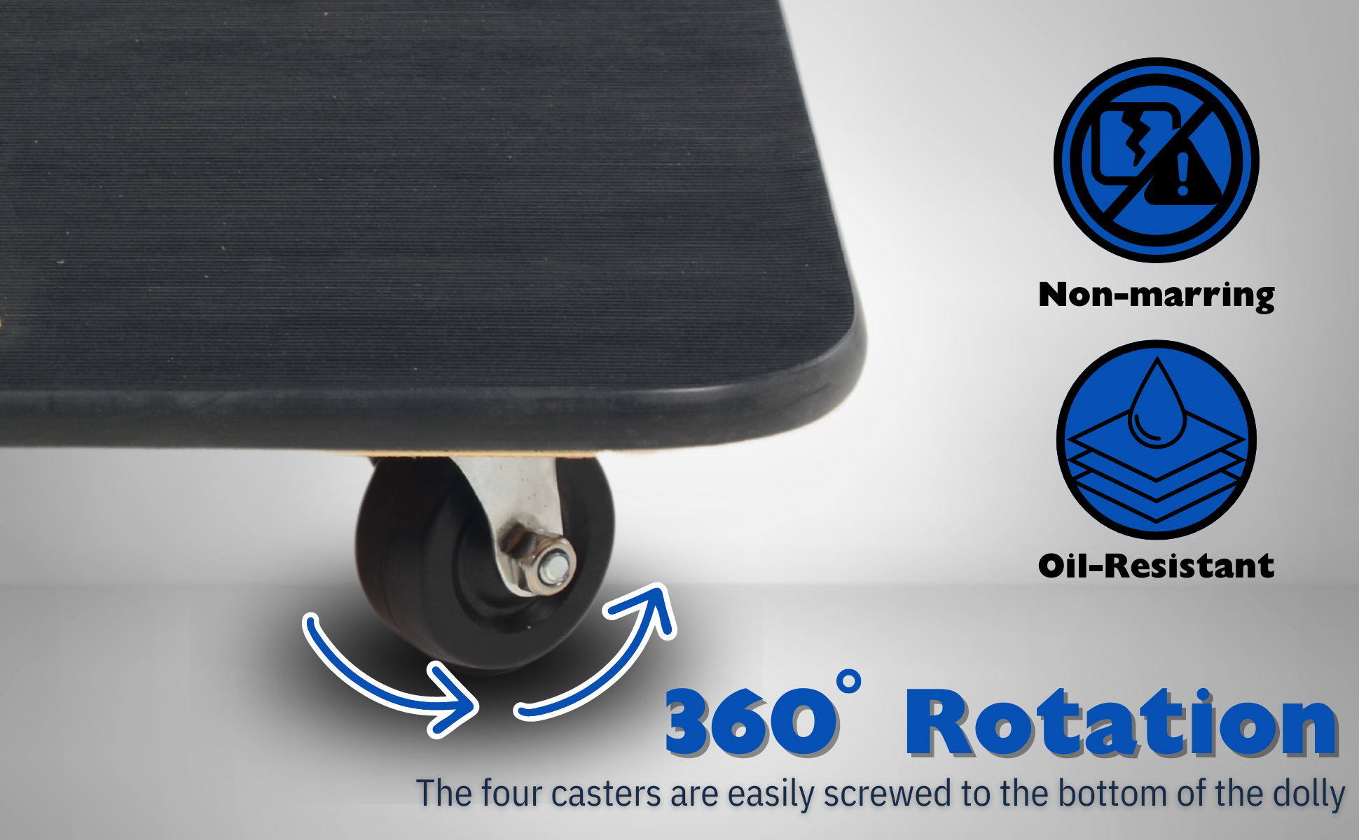 Fiberwood construction dollies feature a rubber padded surface and two hand holes to carry the unit. The PVC edge strip protects walls from scrapes. Units roll on four swivel wheels which are non-marring and oil-resistant. Casters may not be attached for shipping purposes.