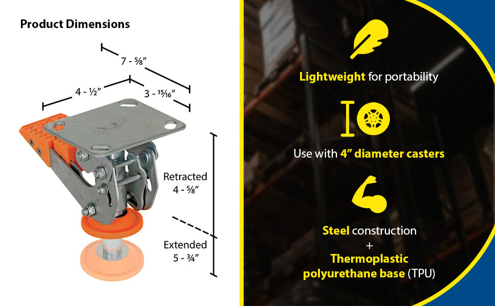 Floor Locks are ideal for maintenance and construction facilities. The unit is designed to create a stable environment, while decreasing the chance of jostling or slight movement. The unit is constructed of steel with a thermoplastic polyurethane base. To use, place the unit close to a desired wheel or caster and raise until tension is built. Once secured, a simple locking device can be activated by applying pressure to the foot pedal.