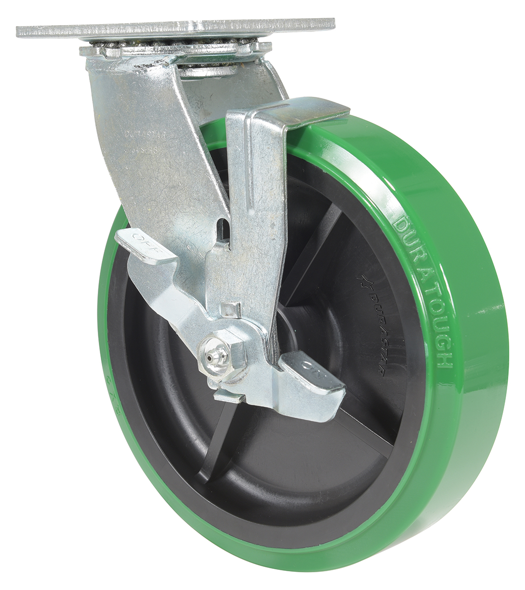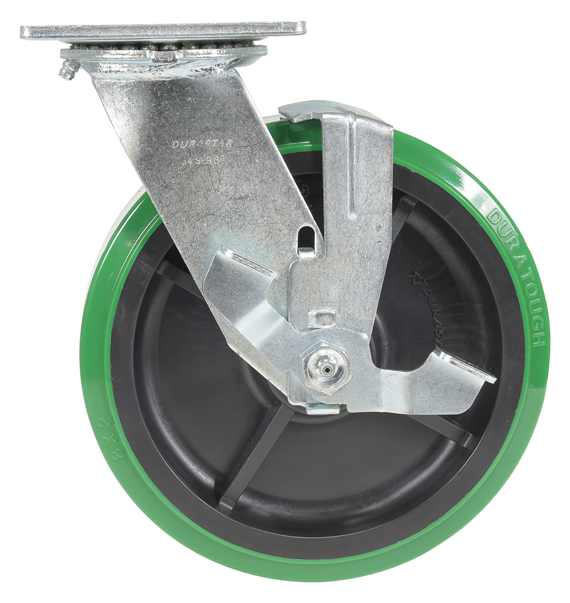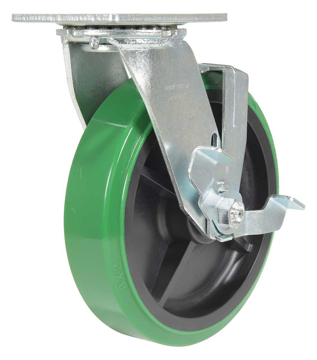 Made with 100% pure polyurethane tread. This caster is a great upgrade for standard polyurethane. Designed using a new liquid cast flow fusion that ensures a 100% mechanical bond to core and "zero" trapped air. It has a high resistance to debris and most chemicals. The proprietary tread provides good floor preservation, and has a longer life performance than standard polyurethanes. Green tread color. 90-95 shore a. Wheel center is constructed of polyolefin.