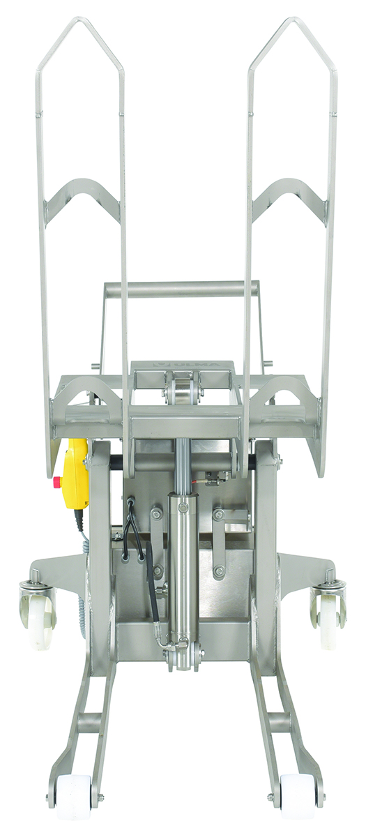 When cleanliness is a must, the tilt master is the perfect asset for the job. A stainless steel construction, with an open design, can be easily cleaned and maintained. The hand held pendant operates the tilting feature to limit the amount of physical activity involved, while also allowing the user to create distance from the tilter during use. Once tilted to the desired position, the user can maintain a more upright posture during use, while minimizing the amount of bending and twisting. Easily accessible battery box for changing and updating batteries as needed. Steering/driving handle is removable.