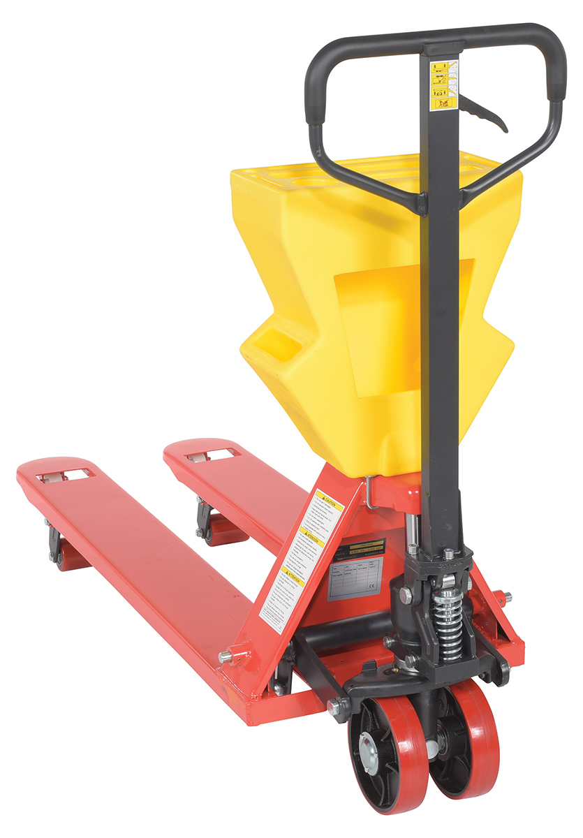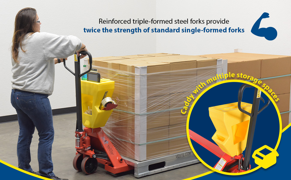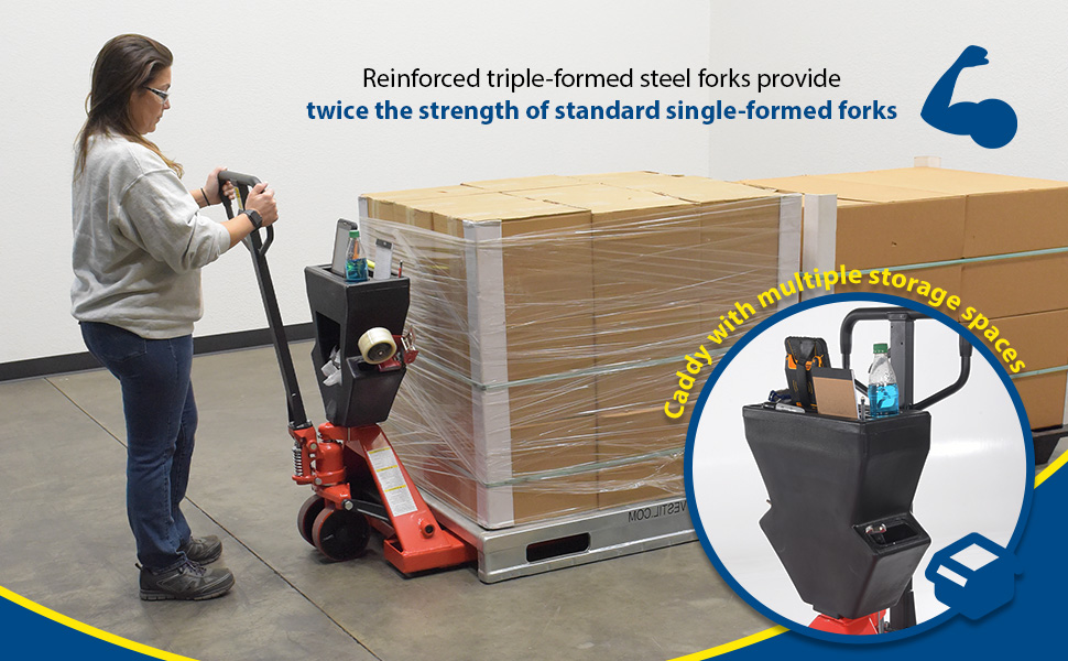A pallet truck with a storage caddy is the perfect bundle of two innovative products. The pallet truck has an ergonomically friendly design with a limited pulling force required, while the caddy allows the user to be more organized and efficient. With a strong powder coated steel construction, the pallet truck moves easily between areas. Nose wheels are located on the front edge of each fork to assist in clean pallet entrance and exit. A molded plastic design allows the caddy to be durable throughout consistent daily use. Installation hardware and instructions included.
