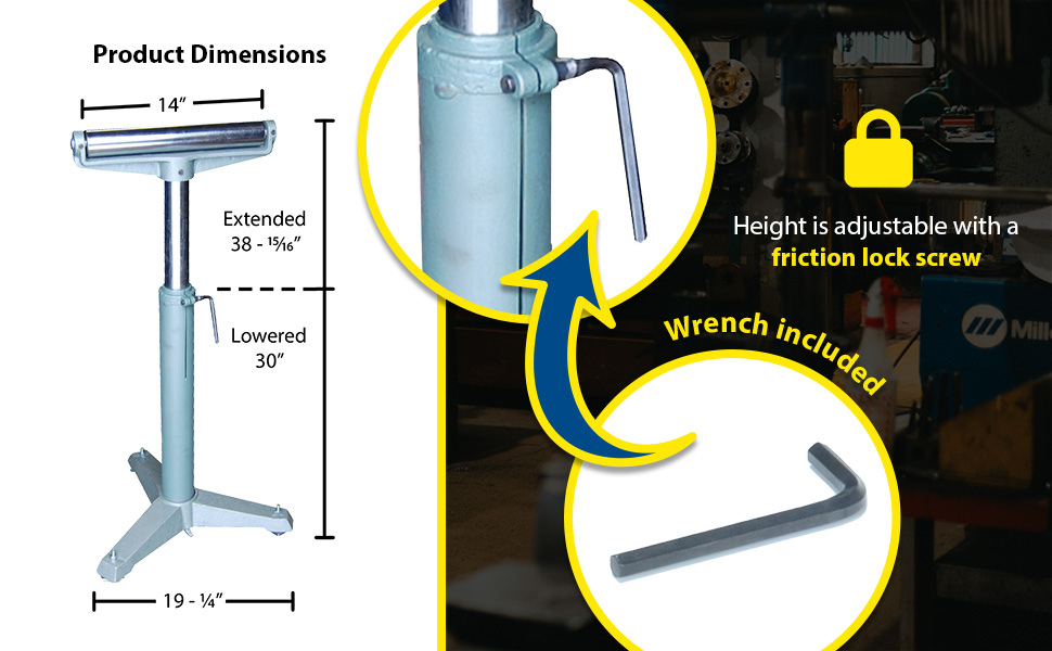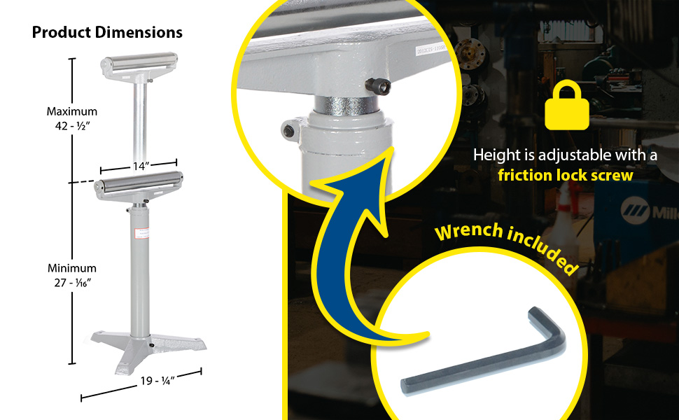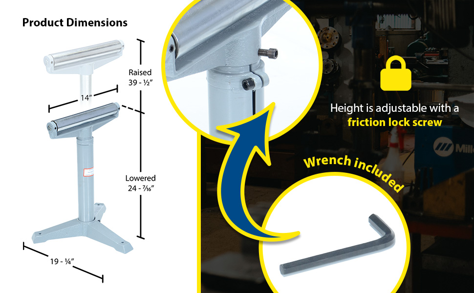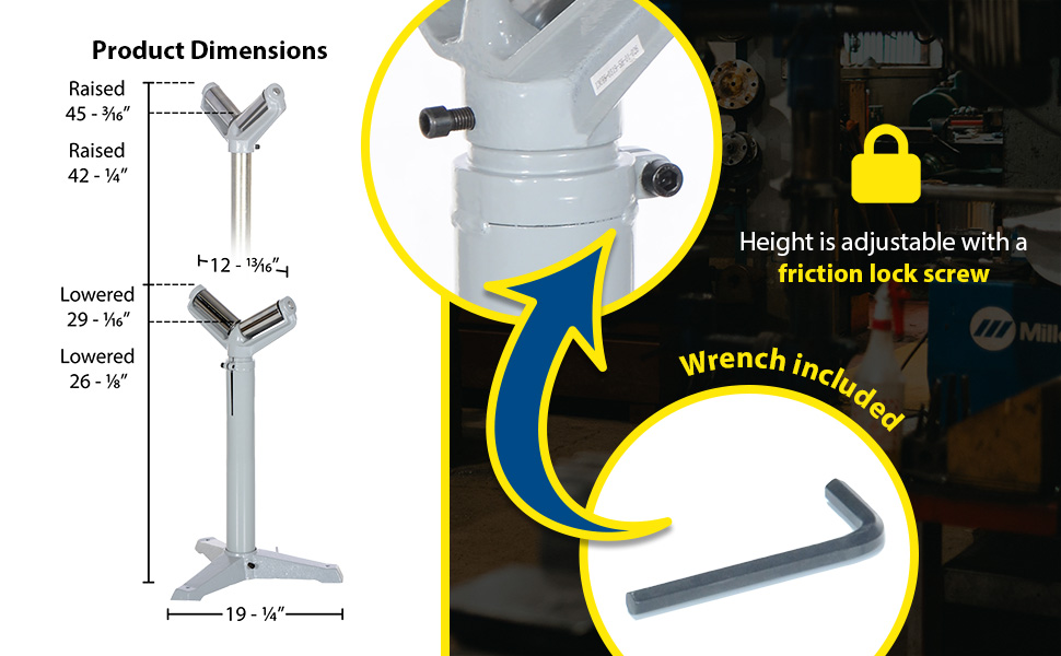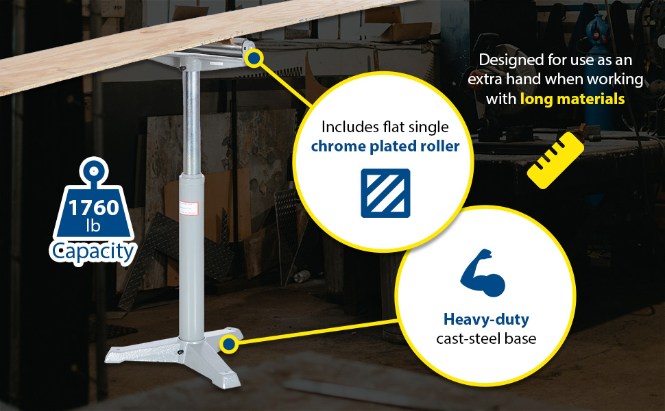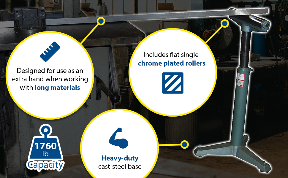 Designed for use as an extra hand when working with long materials. Each stand includes 2" chrome plated rollers and heavy-duty cast-steel base. Choose either v-groove roller design or flat single roller design. The height of each stand is adjusted with a friction lock screw or a gas charged cylinder. Great for use in machine and wood shops. Ships knockdown.