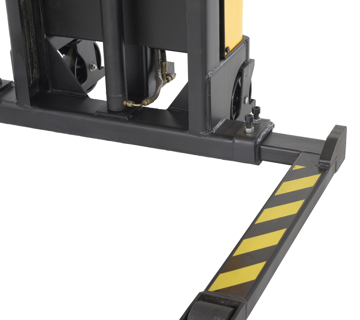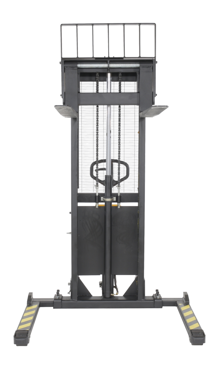 An economical alternative DC powered lift stacker. Ideal for maintenance and commercial applications. This unit can be used as manual hand pump lift or electric powered lift. Ideal when power is not available. High quality hydraulic pump and DC lift system. Compact design and strong steel profile construction. An economical lift to handle tasks such as transporting dies, molds, and skids. Powered with two (2) 12V, 40Ah batteries. Integral battery charger, battery level gauge, and adjustable lowering speed. All models are easily maneuverable using the standard pull handle. Individual forks are 6" wide.