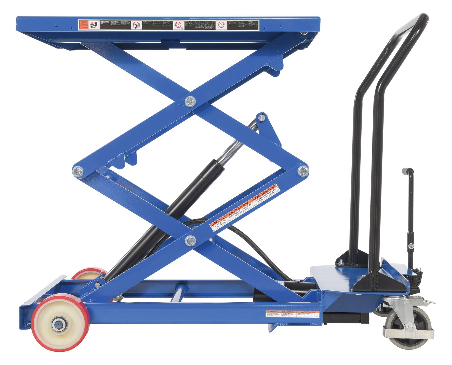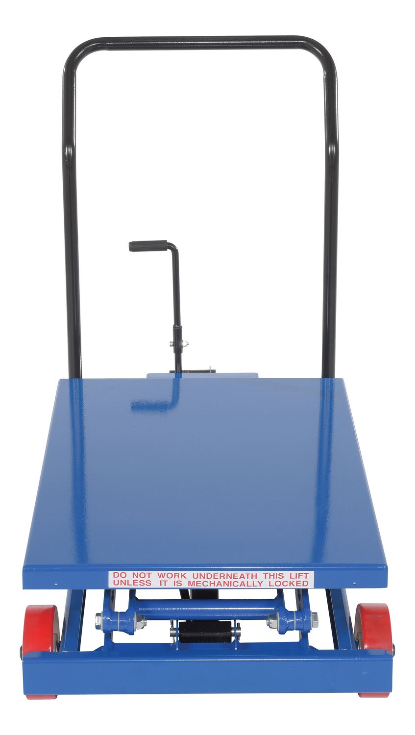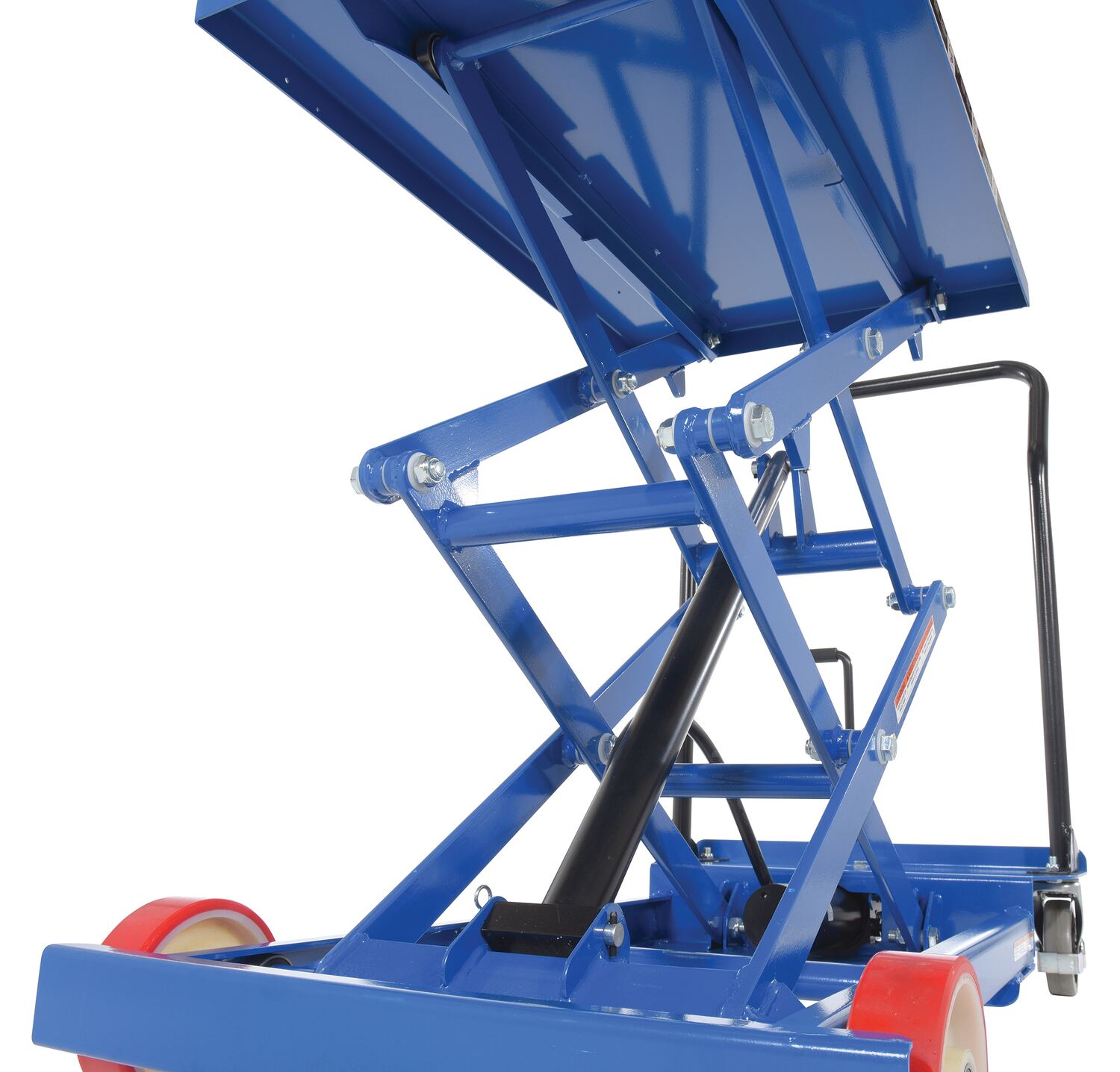 Constructed of heavy duty steel and designed to withstand the most demanding industrial environments. Ideal for lifting and transporting loads, order-picking, die handling, and for use in support of assembly operations. Little exertion is required to raise and lower the deck with the high quality, foot-actuated, single-speed hydraulic pump. The hydraulic system is equipped with an overload protection valve. The hand operated carts have safety stops to prevent an empty deck from lowering while performing maintenance. The foot operated carts have a unique tilt-up table top that allows for safe and easy maintenance. Two (2) rigid front casters and two (2) rear swivel polyurethane casters with brake provide a high degree of maneuverability; each swivel wheel is protected by guards and is equipped with brakes.