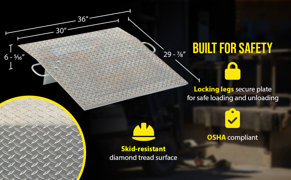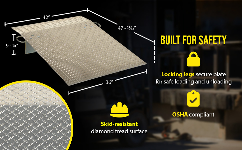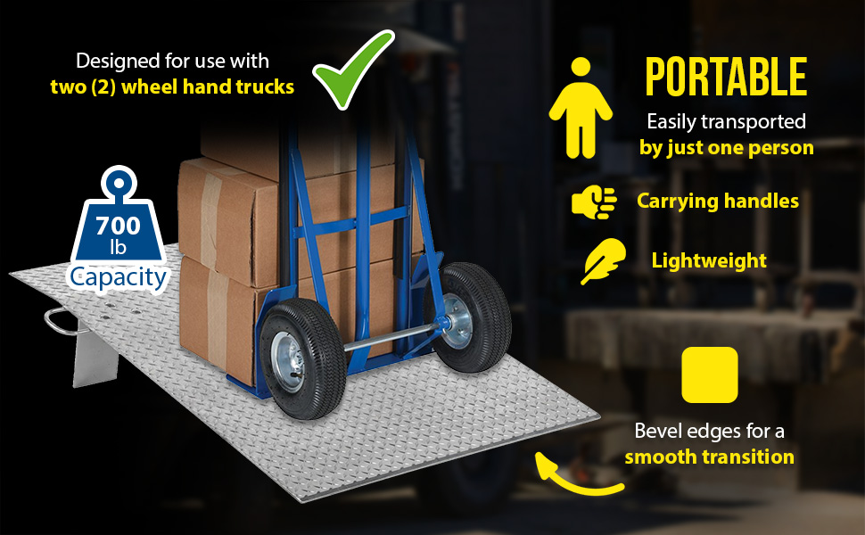 Designed for use with two wheel hand trucks. A convenient, safe and easy way to access loading docks from trucks. Lightweight and easily portable by just one person. Treadplate surface ensures skid-resistant safe traction. Locking legs secure the plate for safe loading and unloading. Complete with bolt-on zinc plated carrying handles and locking legs. The bend or crown is 11 degrees and located 9" from edge of dockplate.