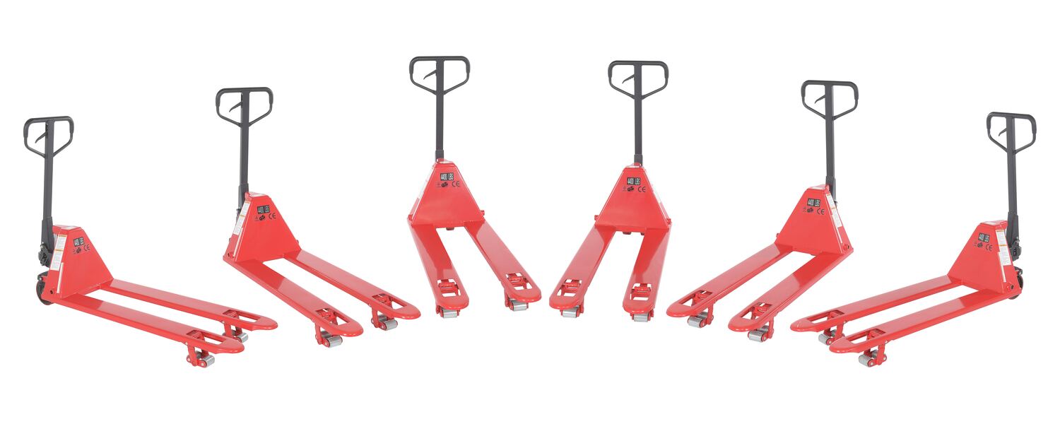 The Low Profile Pallet Truck enters pallets from all four sides. All steel frame is reinforced to handle 4,000 lb. capacity loads. Individual fork width is 7" wide. Wide loop control handle with lift, neutral, and lower functions provides fingertip control. Lifetime lubricated bearings. Hydraulic system has hard chrome plated pump piston with polyurethane seals. Suspension system has a heavy-duty thrust bearing. Complete with adjustable push rods, polyurethane wheels, steel load rollers and red baked-in powder-coated toughness.