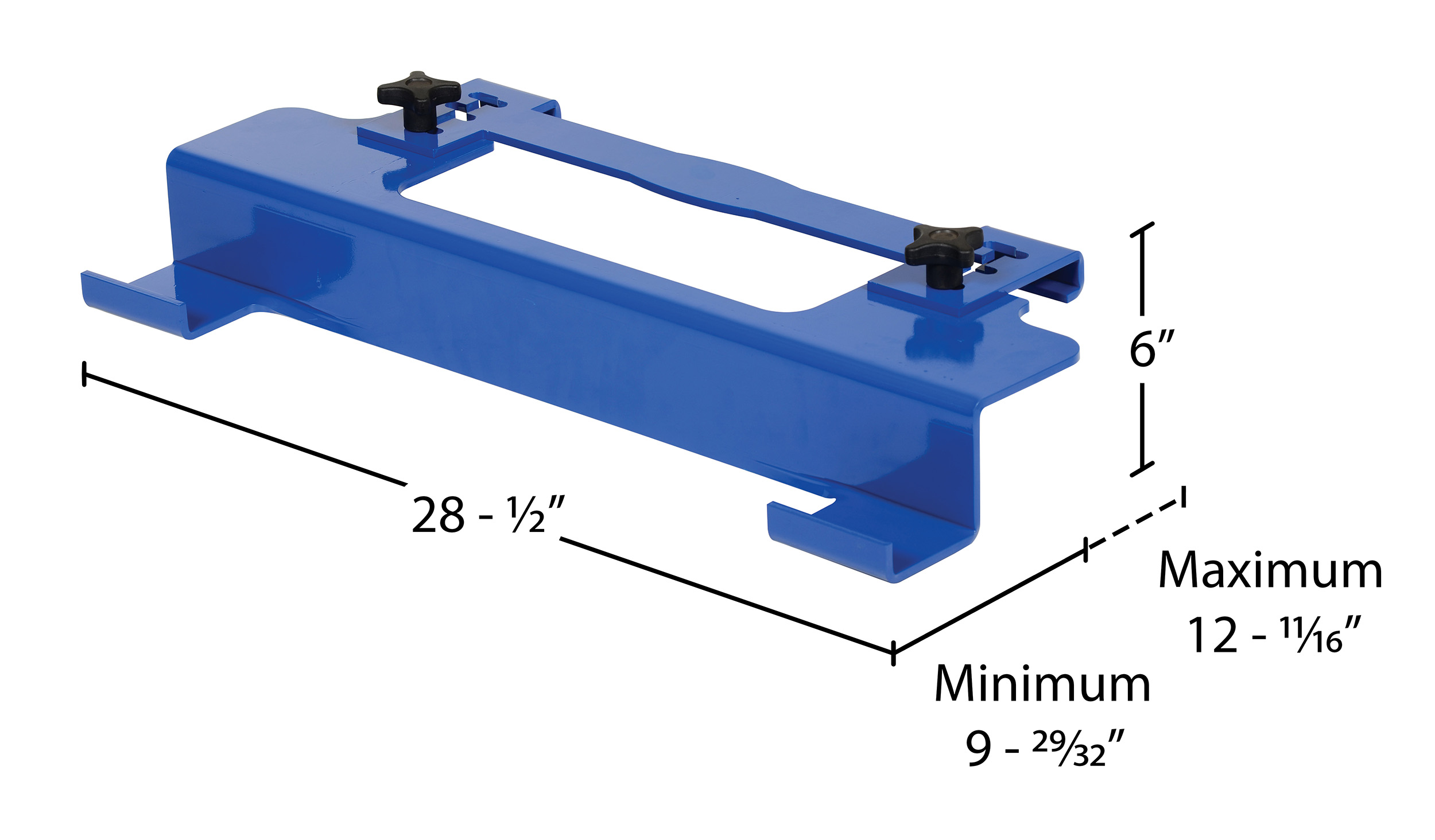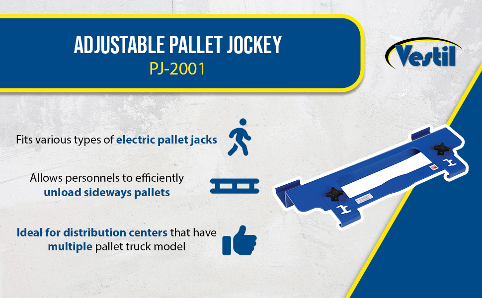 The Adjustable (PJ-2001) unit is designed to fit various types of electric pallet jacks. To use, simply loosen wing bolts and slide adjustable brackets to proper slot, then tighten wing bolts.