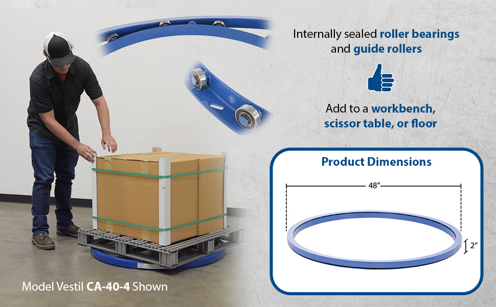 The Manual Carousels rotate materials with the assistance of an operator. Now loading and unloading operations can be done more efficiently; minimizing fatigue and risk of back injury. The carousel may be added to an existing work bench, scissor table, or simply placed on the floor. Constructed of two pieces of rolled structural angle. A series of standard sealed ball bearings transfer the load smoothly and evenly to the supporting surface. Four guide rollers keep the rings aligned.