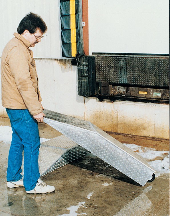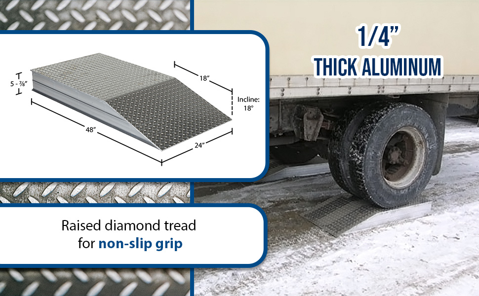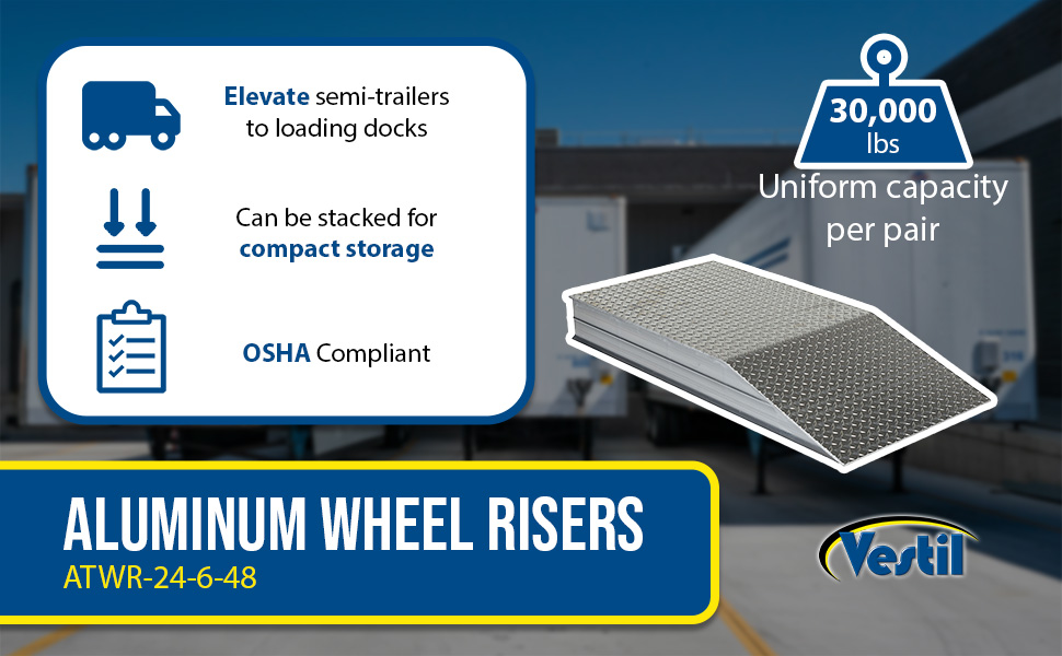 ATWR ApplicationElevate semi-trailers to loading docks for maximum serviceability during loading and unloading operations. Manufactured from heavy-duty aluminum tread plate for positive traction. Welded all aluminum construction. 30,000 lbs. capacity per pair (Sold Each). Wheel Risers are designed to raise the trailer for loading and unloading to facilitate compliance with OSHA/ANSI B56.1 part 3 sec 7 requirements for a maximum grade of ascending or descending loaded fork trucks.