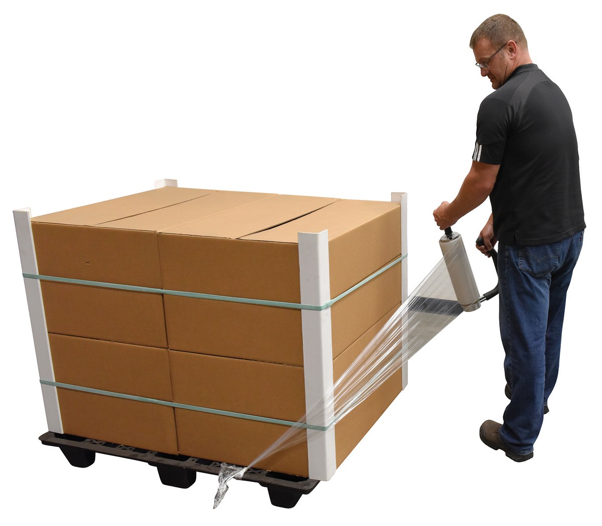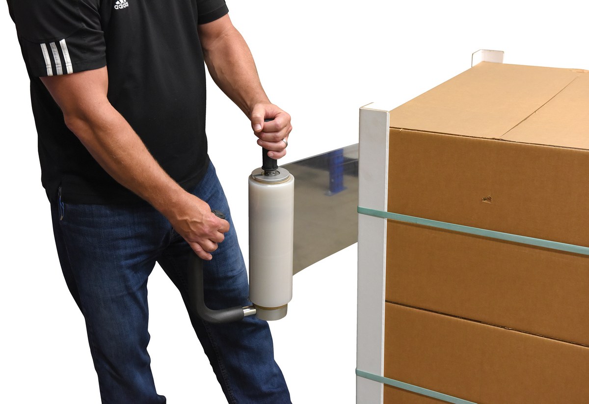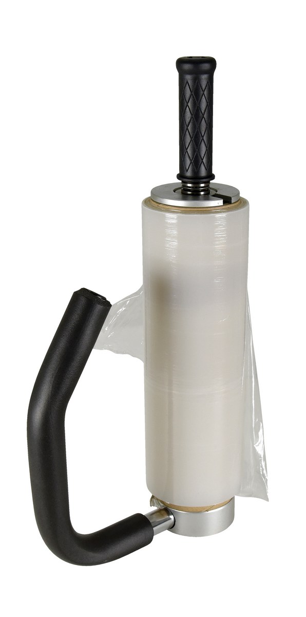 Hand Held Stretch Wrappers (models SW-HAND-R & SW-HAND-BG) are lightweight, freewheeling dispensers that maintains precision tension control that insures a tight, smooth application. The ergonomically bent, foam covered handle reduces both bending and fatigue, while allowing operators to apply the bottom row of wrap just as tight as the top. Accommodates rolls up to 8" in diameter.