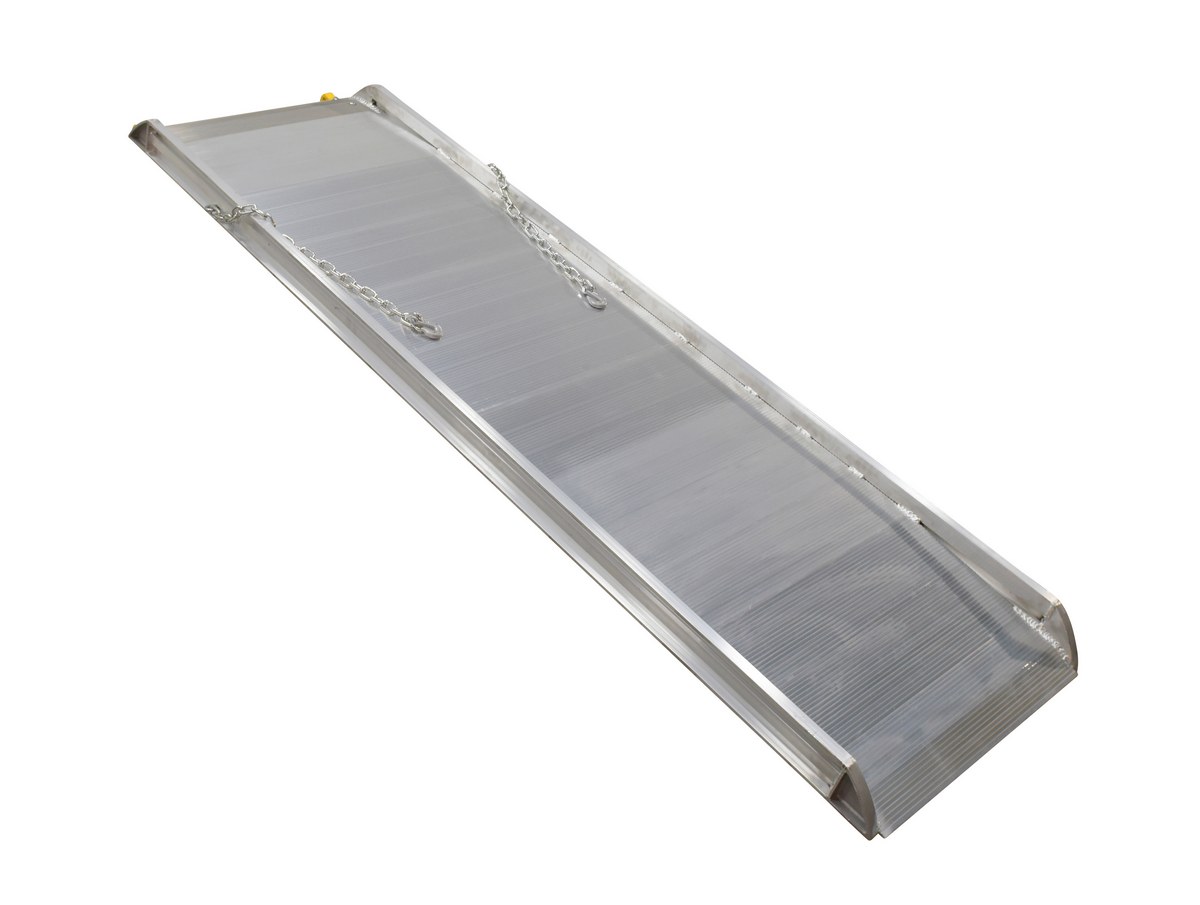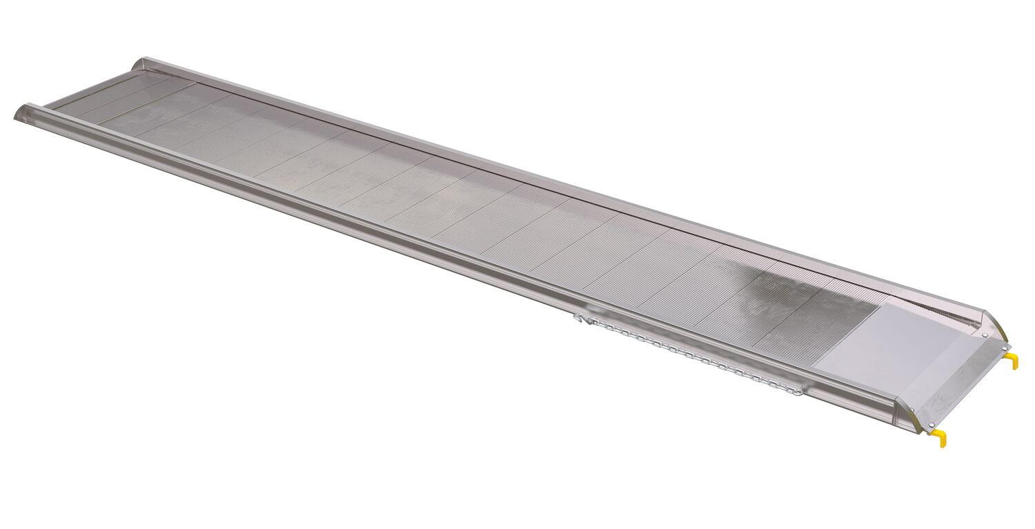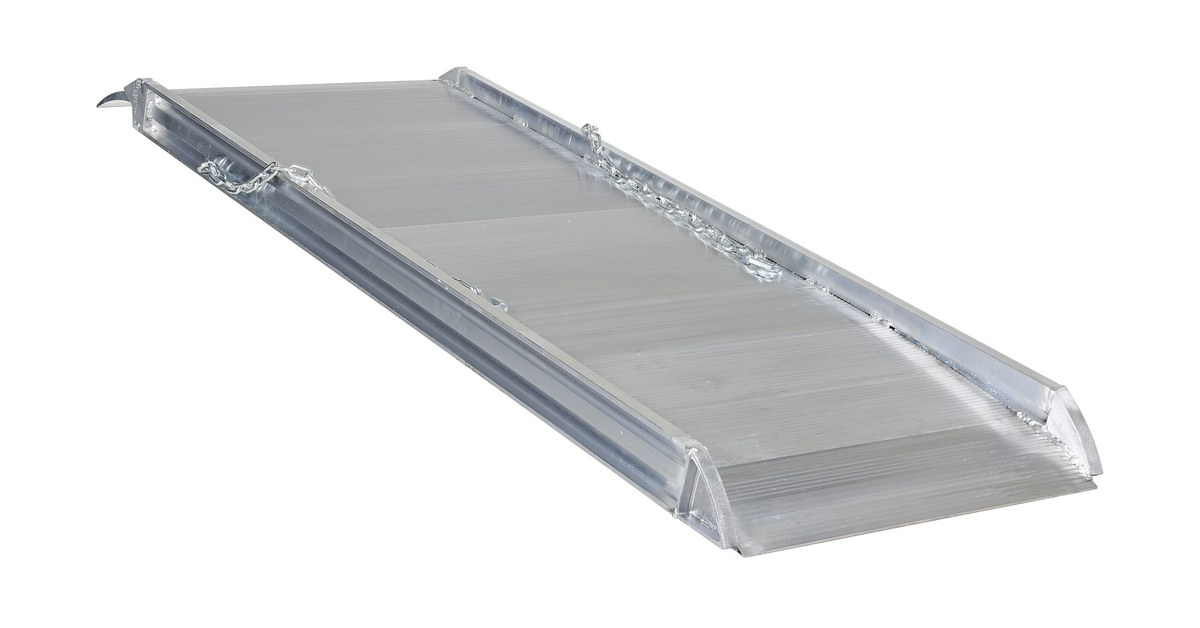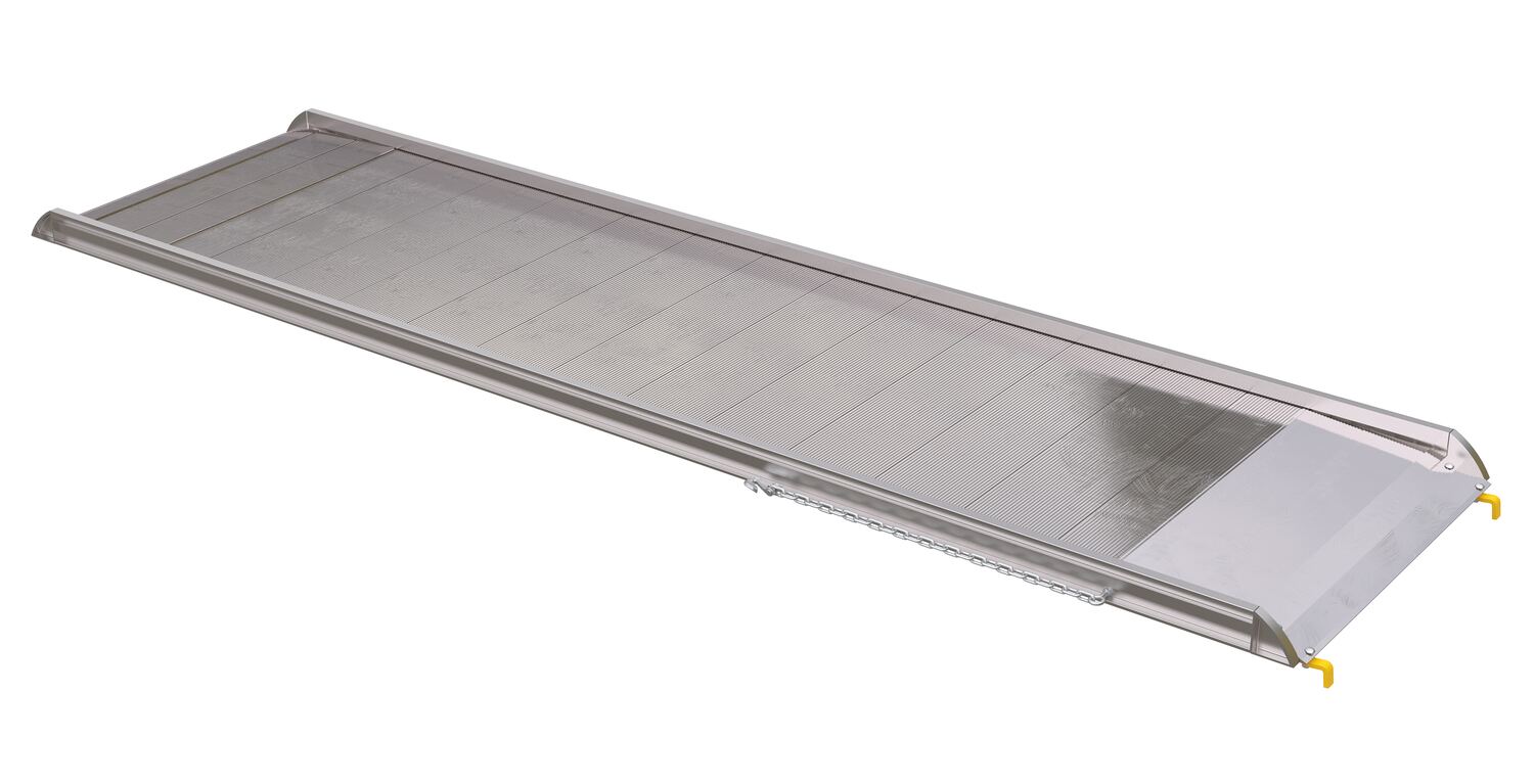 The Aluminum Walk Ramp enables delivery men, shippers, and receivers to load and unload trucks when docks are unavailable. Ramps feature a 1-1/2" high safety curb on each side. Heavy duty steel chains with steel grab hooks are attached to each side of ramp for safely securing ramp to truck. Constructed of strong aluminum alloy with non-skid tread surface. The ramp is lightweight and easy to handle. Available in either an overlapping style that rests on the truck bed, suffix "A", or steel hook style that mounts onto the truck extensions, suffix "B".