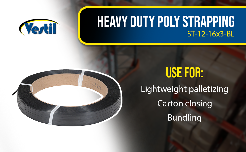 ST-12-16X6-BL ST-12-16X6-BLPolypropylene Strapping 1/2 In. Width 9,000 Ft. 16 In. x 6 In. Core BlackTensile Strength (lb.): 300