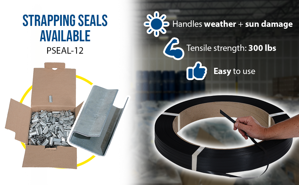 This poly strapping is the most commonly used strapping material. Polypropylene strapping is an excellent choice for light duty palletizing, carton closing, and bundling. Poly strapping seals are made from galvanized metal with a smooth inside surface which clutches to the poly strapping. These smooth seals offer great seal efficiency.