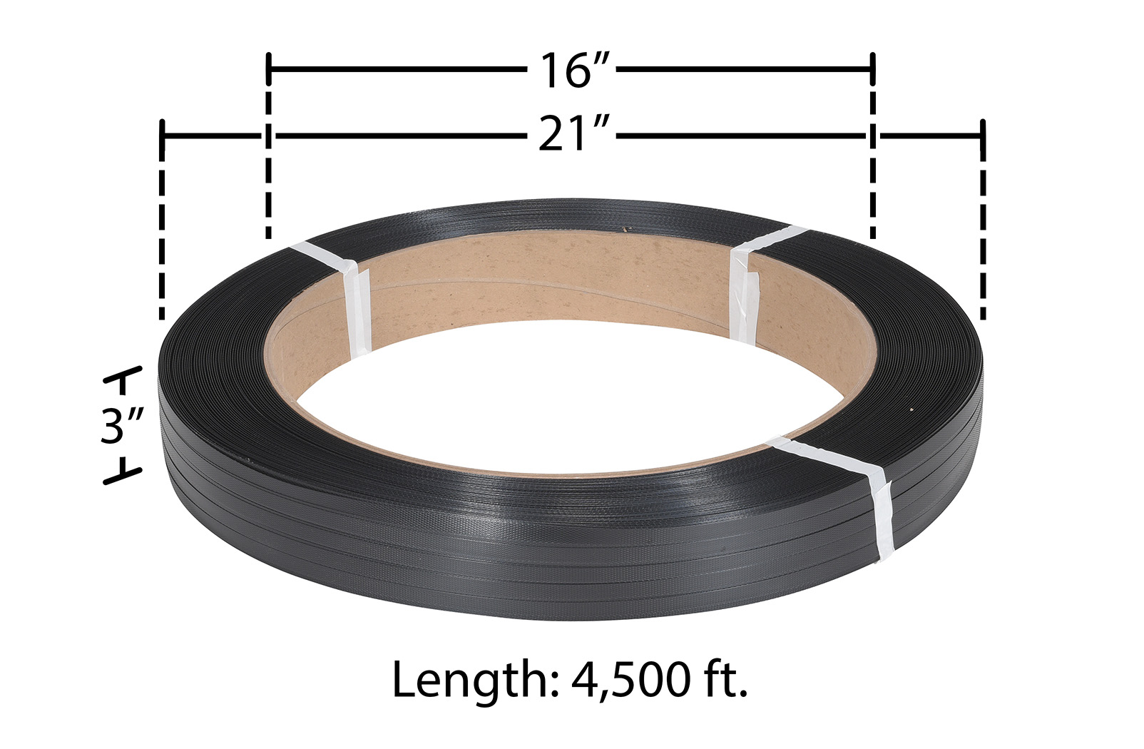 ST-12-16X3-BL ST-12-16X3-BLPolypropylene Strapping 1/2 In. Width 4,500 Ft. 16 In. x 3 In. Core BlackTensile Strength (lb.): 300