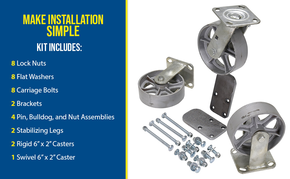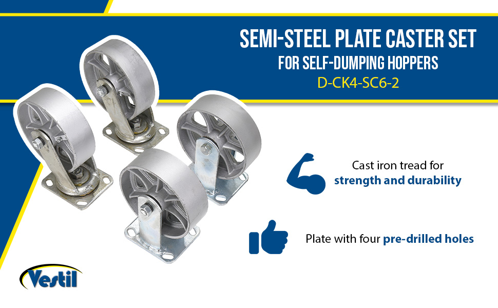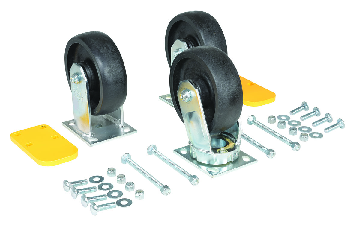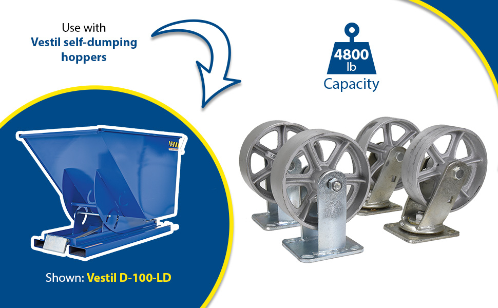 Transport loads with portable hoppers. The maximum weight capacity is the lowest weight capacity of either the hopper or the caster. Weight of hopper must be considered when calculating usable capacity. Sets include two (2) rigid, two (2) swivel casters. For the H series 1/4 and 1/2 cubic yard hoppers only three (3) casters are included, two (2) rigid and one (1) swivel, in addition to bolt on stabilizing legs for the back. Casters are bolted-on by utilizing the factory stamped hole in the fork tubes. Casters are shipped uninstalled to prevent freight damage.