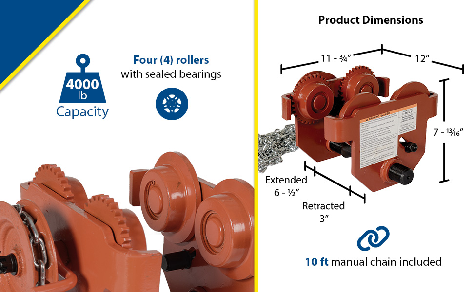 E-MT-4-C E-MT-4-CSteel Geared Eye Manual Trolley 4000 Lb. Capacity OrangeUniform Capacity (lb.): 4,000