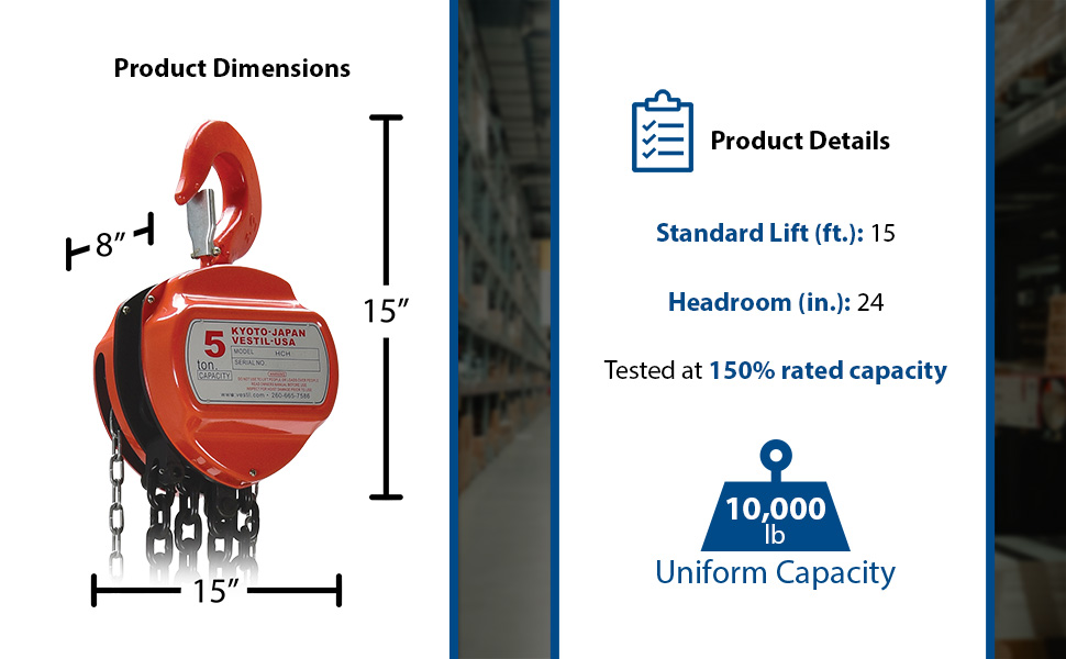 | Steel Manual Chain Hoist 15 Ft. Lift 10,000 Lb. Capacity Orange | Uniform Capacity (lb.): 10,000 Standard Lift (ft.): 15 | 117 |