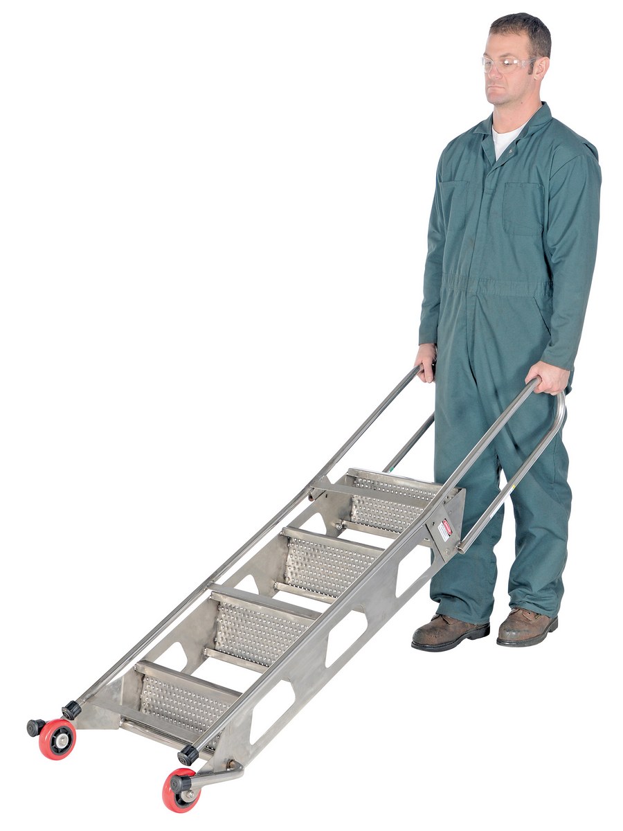 Locking foldable design saves on storage space when ladder is not in use. Ladder folds after unlocking spring-loaded detent pin. Once unit is folded, tilt back on wheels for easy portability. Available in either carbon steel or stainless steel. The steps are perforated to provide a non-slip surface. The ladders have 7" deep steps and a climb angle of 58 degrees. Stainless steel models are 202 grade. Complies with ANSI 14.7 and OSHA 1910.29 specifications.
