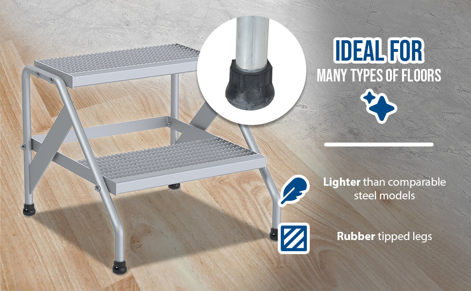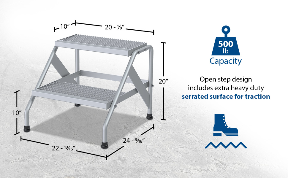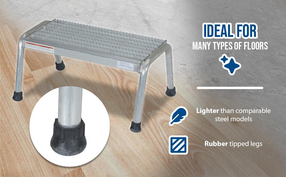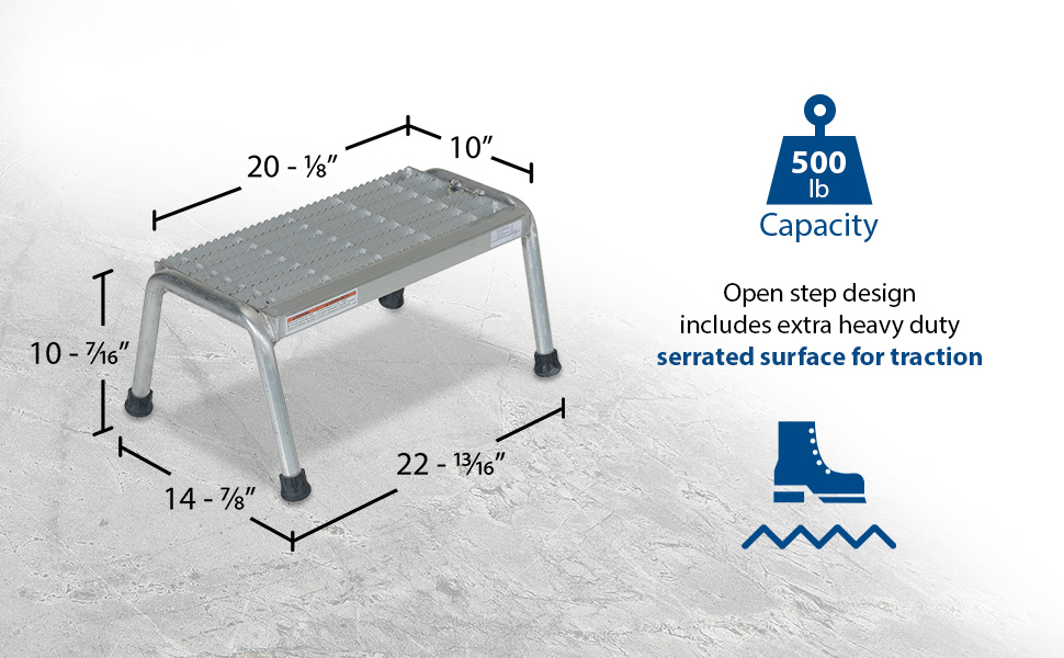 Ideal for industrial or commercial applications. Strong design yields a uniform capacity of 500 pounds, but is lighter than comparable steel models. Open step design includes extra heavy duty serrated surface for traction. With rubber tipped legs, this step ladder is ideal for use on many types of floors. Complies with OSHA 1910.24 specifications.