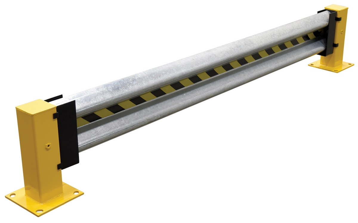 Protect personnel and equipment both visually and physically with our Guard Rail Systems. These economical systems can be utilized indoors or outdoors. Ideal for protecting corners of buildings and machinery from fork truck and vehicle damage. Choose between one, two, or three high rail systems. Tubular posts are machined for continuous or perpendicular rail mounting. GR series has rail slotted mounting holes 3/4" x 2-1/2" provided. Rail mounting hardware is included with posts. Floor mounting hardware is sold separately. Deduct 5" when overlapping on a shared post. Units are rated for 4,000 lbs. at 4 mph.