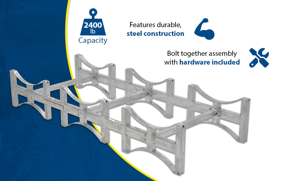 Steel Drum Racks accommodate 55 gallon drums and feature four-way fork truck access. Not recommended for stacking more than four (4) racks high. All steel construction with 1/4" formed steel cradles. Bolt together assembly with hardware included. Yellow painted finish. Models with suffix -SS are stainless steel. Models with suffix -G are galvanized. Drums, drum racks, and drum carts all sold separately.