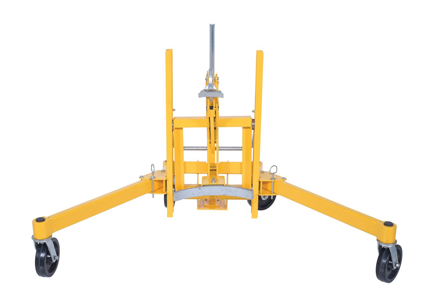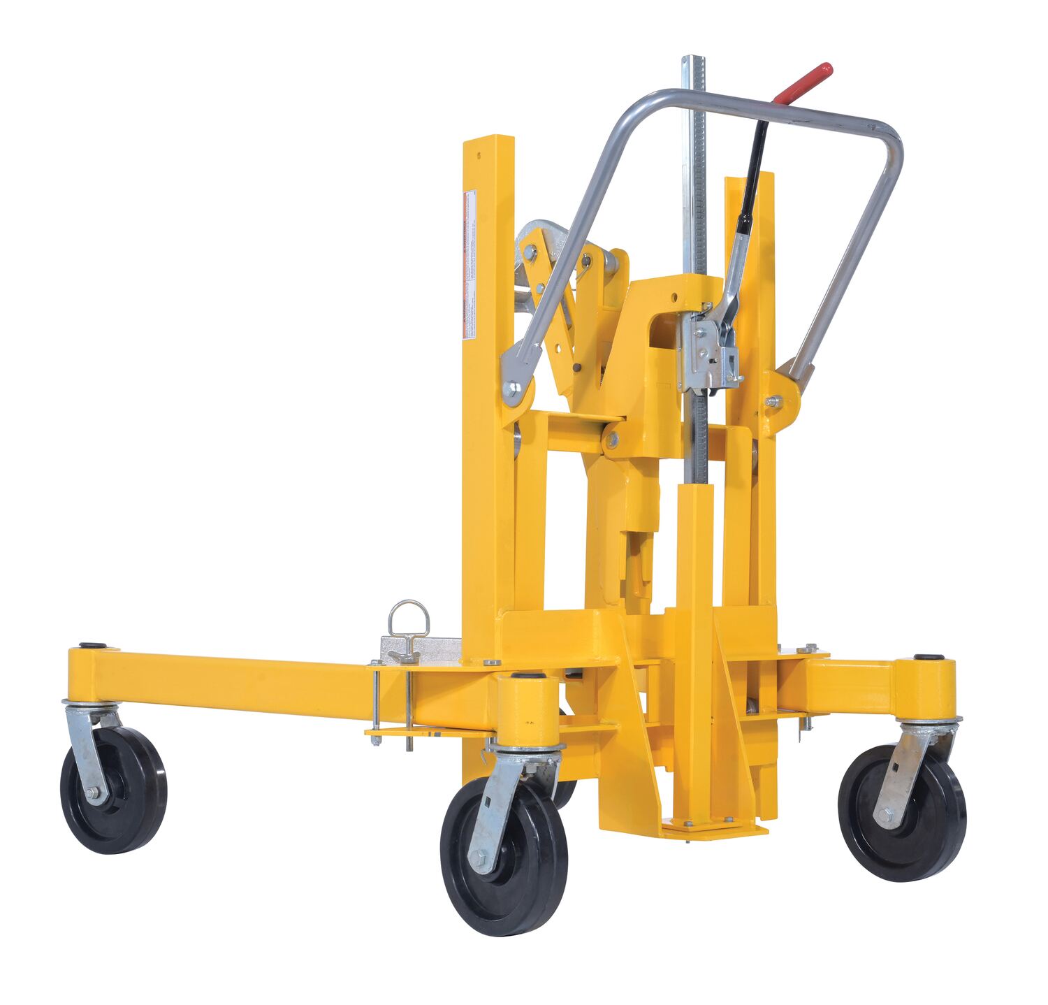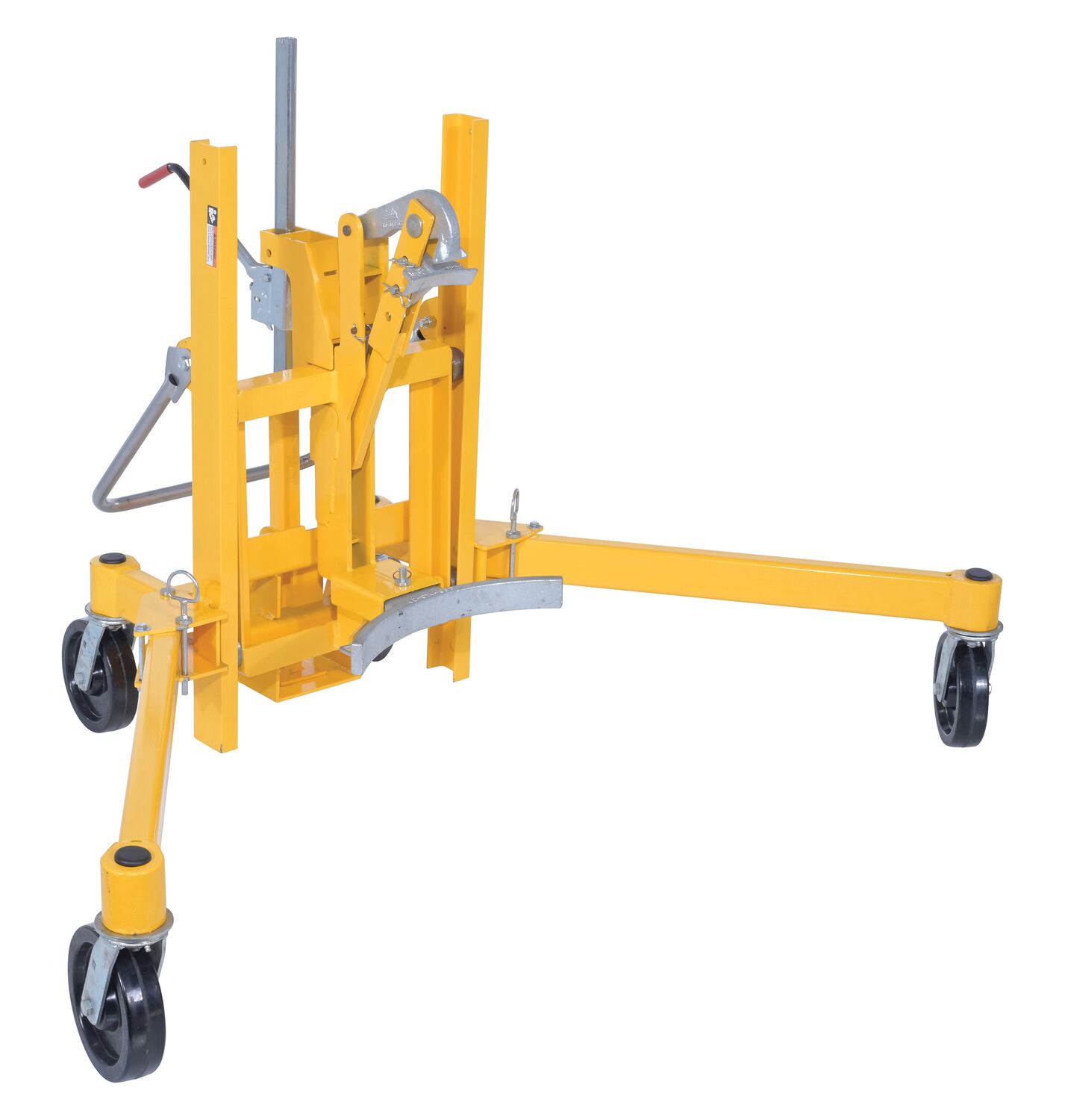 Unique portable unit designed to lift and transport steel, plastic, and fiber drums with a top lip. Steel jaw securely grips the top lip of the drum. Available with either a manual mechanical ratchet, foot pump hydraulic, or DC powered lift mechanism. Straddle legs rotate for access to drums on pallets. Units roll on four (4) 8" x 2" phenolic swivel casters. The push handle folds down for easy access to ratchet and foot pump. All welded steel construction. Baked-in powder coated toughness with a safety yellow finish. Optional scale weighs drums to an accuracy of +/-0.5 pounds. Optional scale includes (6) AA cell batteries and an AC adaptor.