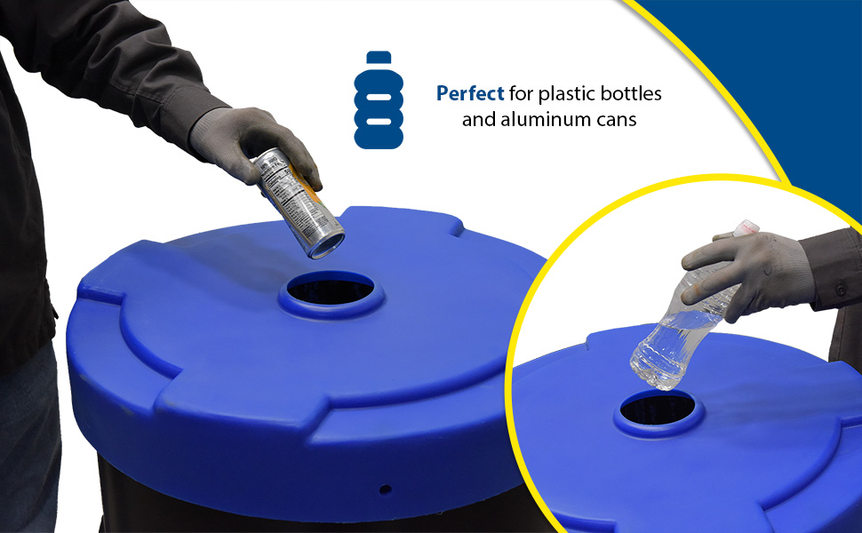 Collecting aluminum cans or plastic bottles could not be easier with Recycling Lids. Fits on open head plastic or steel drums only with lid and ring are removed. Low-density polyethylene construction. Fits snug to resist blowing off in outdoor environments or being tampered with by people or animals. CANF models have a flap to help discourage the removal of contents.