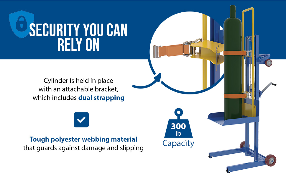 Perfect for transporting gas cylinders and loading them onto a truck. This unit raises cylinders by simply turning a mechanical hand crank to the desired height. Maximum cylinder diameter 11-1/2" x 56" tall. Cylinder is held in place with a tough polyester webbing strap that guards against damage and slipping.