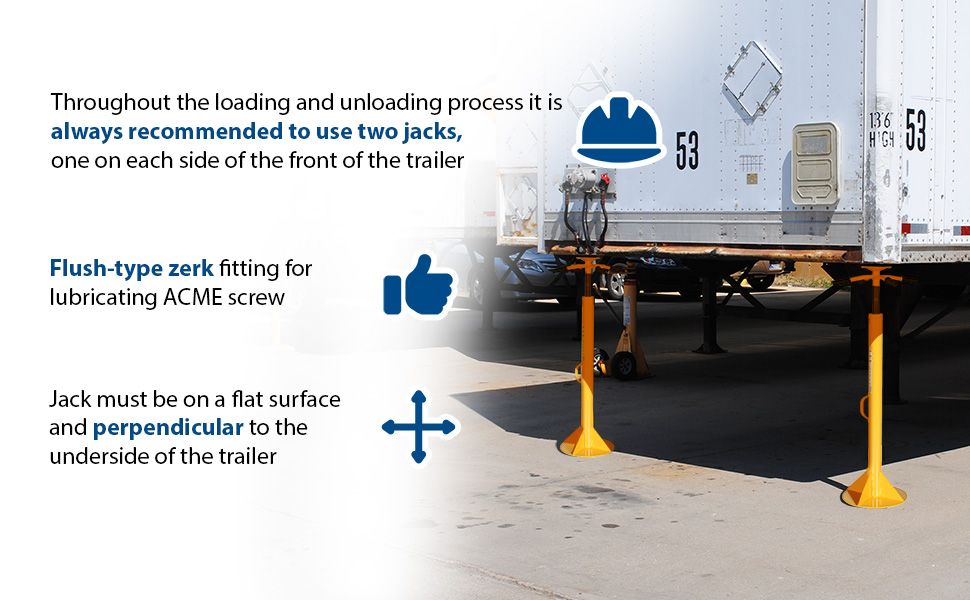 Trailer Stabilizing Jacks are used to prevent up-ending of semi-trailers when they are not connected to a tractor during loading and unloading operations. Throughout the loading and unloading process it is always recommended to use two jacks, one on each side of the front of the trailer. The trailer must be situated on a flat, stable and improved (preferably concrete) surface, while the jack sits perpendicular to the underside of the trailer. Every jack is built of a high strength steel construction with a flush-type zerk fitting for lubricating ACME screw. A yellow powder coat finish and a reflective collar for visibility at night are both included. Each jack meets OSHA regulations when used with wheel chocks. **The color of handles included with models may vary between red and black**