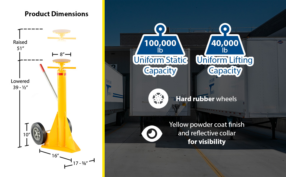 SJ-35-EF SJ-35-EFSteel Economy Stabilizing Jack with Hard Rubber Wheels 18-1/4 In. x 16-5/8 In. x 41 In. 50,000 Lb. Static Capacity YellowUniform Static Capacity (lb.): 50,000