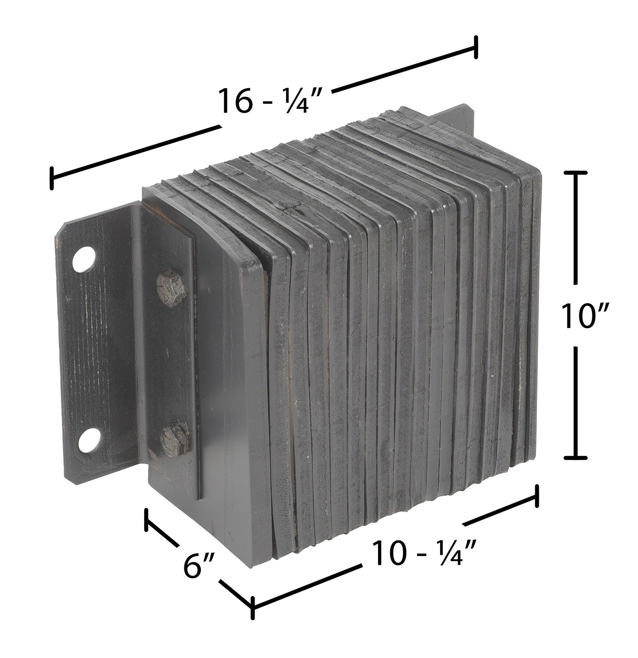 The laminated Dock Bumper provides durable, economical protection for loading docks and trailers. This unit is constructed of fabric reinforced rubber from recycled truck tires. The pads are laminated between painted structural angles and held together with steel tie rods. The width is bolt hole center to bolt hole center. Installation hardware sold separately.