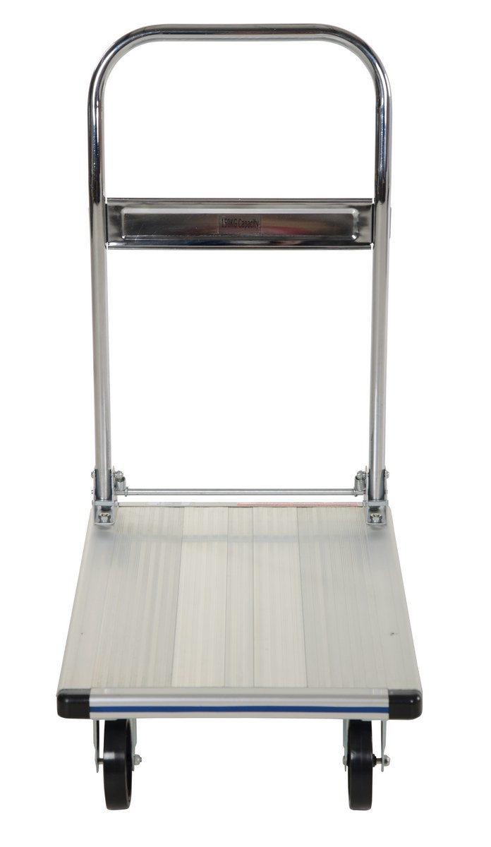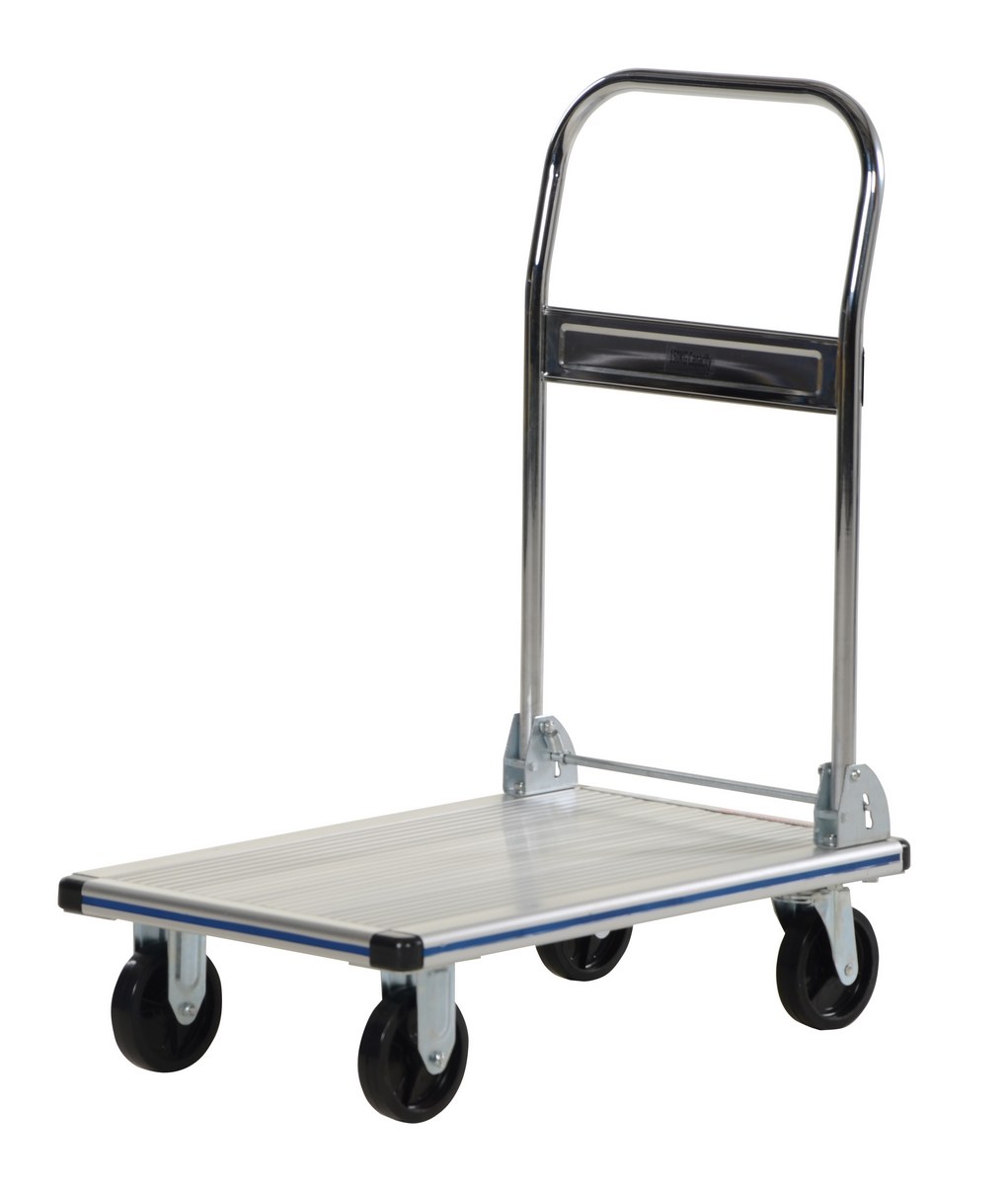 Use this Aluminum folding handle Platform Truck with non-marking casters for safe transportation of stacks of paper, small parts and other lightweight equipment. Ideal for maintenance rooms, offices, schools, hospitals, etc. Plastic corner protectors enhance durability and protect surroundings. The unit has a rugged aluminum construction with single handle design.