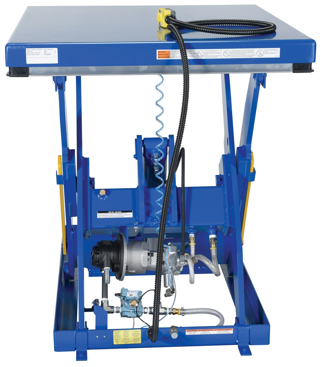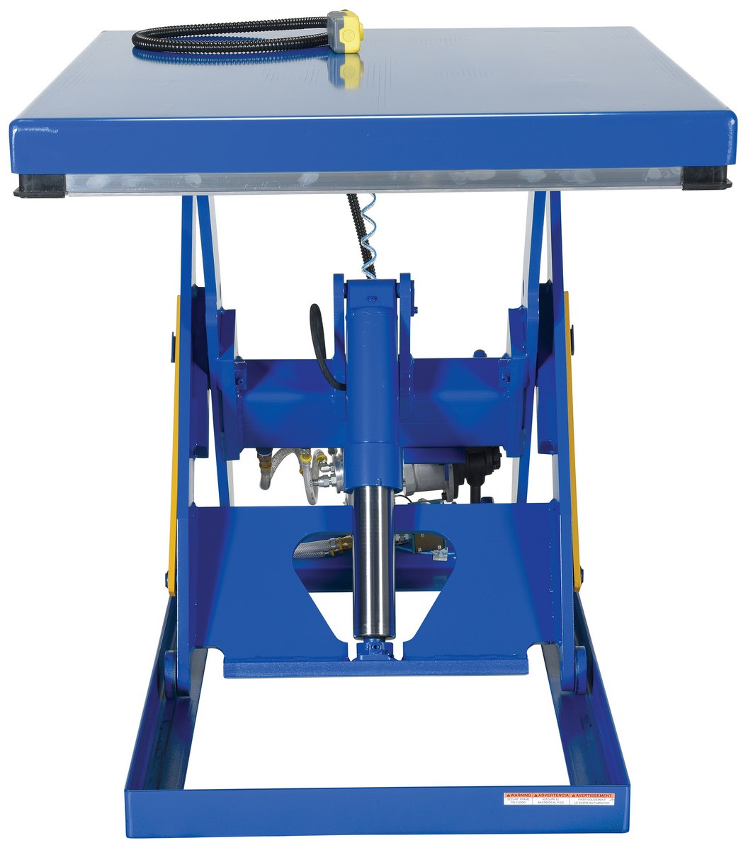 The rotary air/Hydraulic scissor lift table utilizes the convenience of factory air to power the lift table. Simply connect to an air supply through a filter, regulator, lubricator, and you will have a lift table suitable for a wide range of applications and operating environments. It features a pneumatic upper travel limit switch, safety toe guards, cylinder with internal safety velocity fuse, two button hand control, and life-time lubricated sleeve bearings.