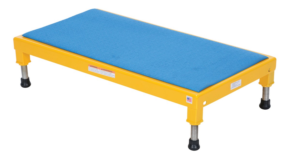 Steel Adjustable Work-Mate Stand 36 In. x 19 In. x 6-3/4 In. 500 Lb. Capacity YellowThe adjustable work-mate stand minimizes fatigue by elevating workers to heights that are comfortable and ergonomically correct. Especially useful when multiple shift employees operate the same piece of machinery. The ergonomic matting deck style provides comfort for the operator who stands all day. The height of each leg can be adjusted individually to ensure proper working height.