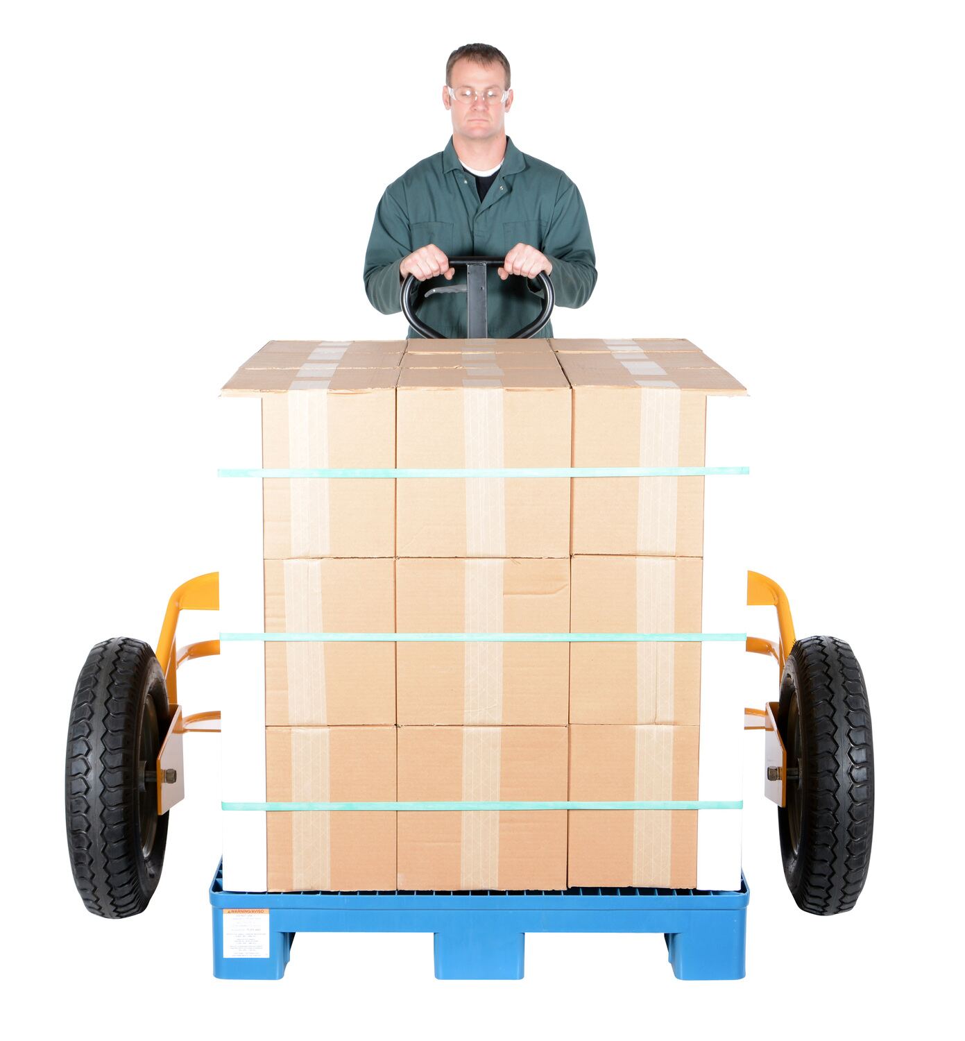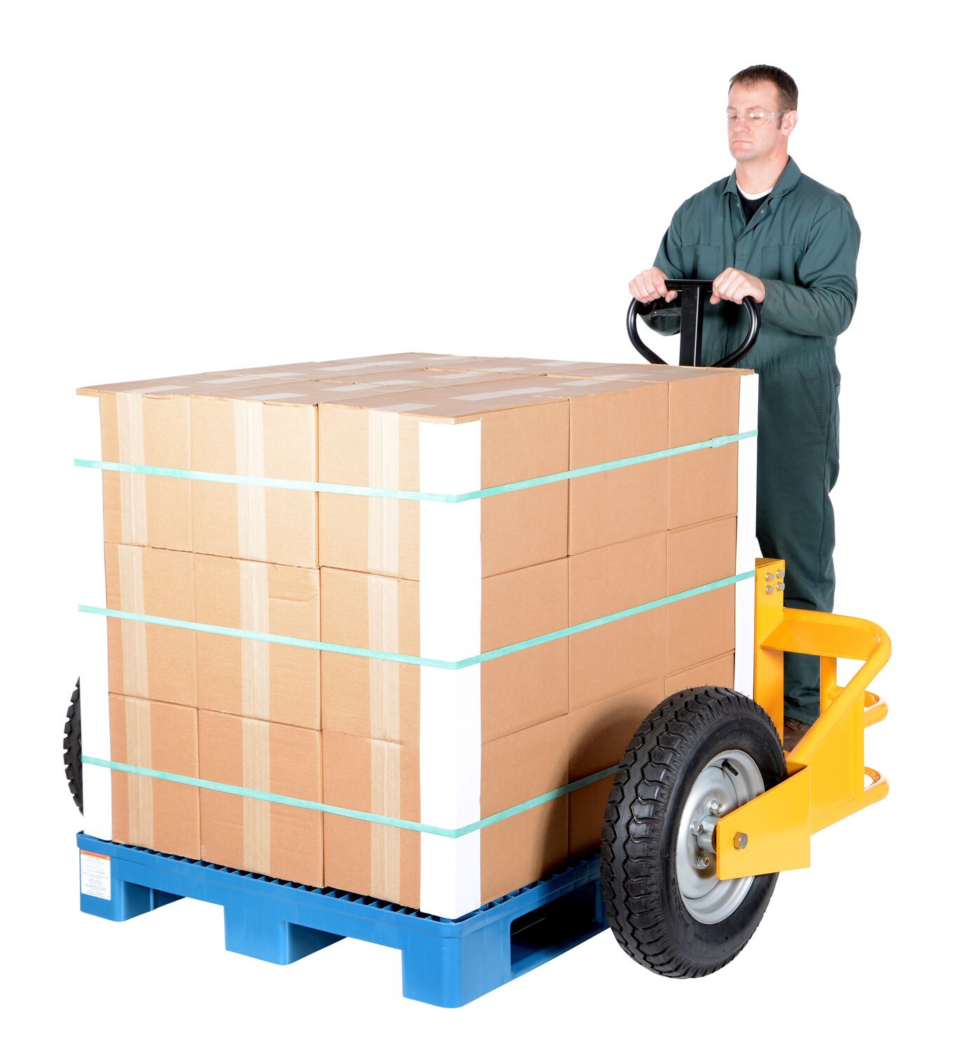 The all terrain pallet truck is lightweight yet the strong tubular frame design handles evenly distributed loads. The large wheels allow for movement over most surfaces. Unit is great for use at construction sites, gravel pits, and nurseries. It's easy to operate with three position handle, up, down, and neutral. Unit rolls on pneumatic front tires and pneumatic steering wheels.