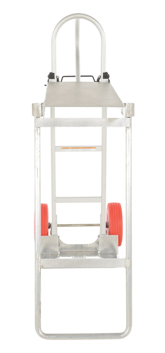 This lightweight aluminum hand truck features an integral work bench. Work bench conveniently folds flat for storage. Now a sturdy work bench can be moved to where it is needed most. Provides for a more comfortable and ergonomically correct work position. P-handle design allows for easy maneuverability.
