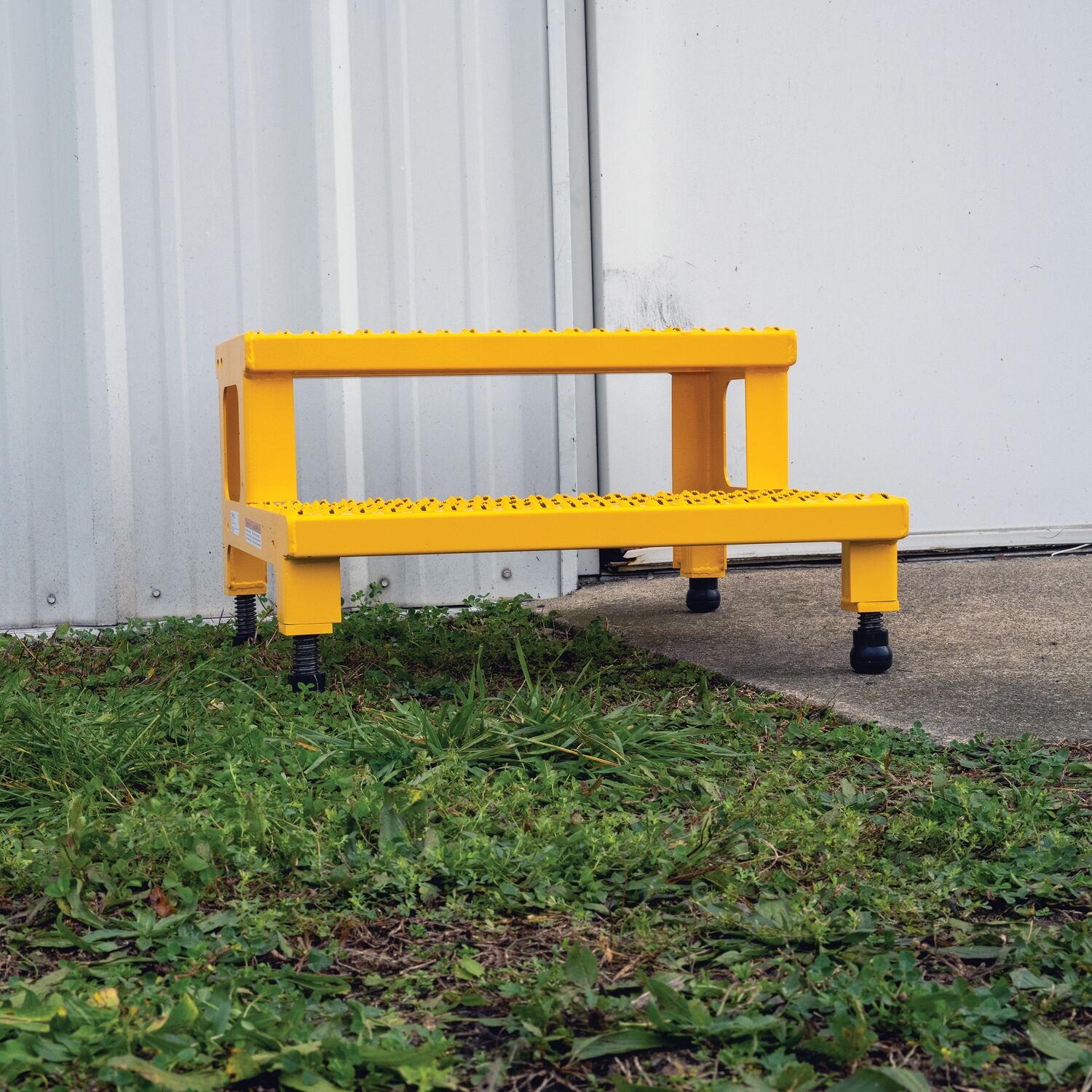 Steel Adjustable Step Mate Stand 2 Step 22-7/8 In. x 23-13/16 In. x 15-1/4 In. 500 Lb. Capacity YellowThe adjustable step-mate stand can be used as either a comfortable worker platform or a semi-permanent step. The serrated surface ensures safe footing. The legs adjust individually by screwing them into or out of the leg base.