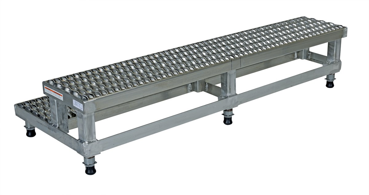 Aluminum Adjustable Step Mate Stand 2 Step 22-3/4 In. x 60-1/8 In. x 14-1/2 In. 500 Lb. Capacity SilverThe adjustable step-mate stand can be used as either a comfortable worker platform or a semi-permanent step. The serrated surface ensures safe footing. The legs adjust individually by screwing them into or out of the leg base.