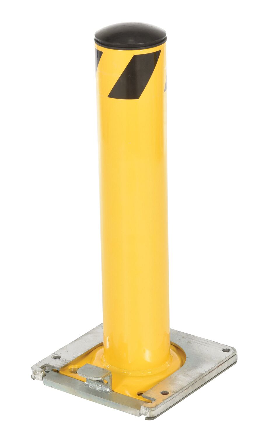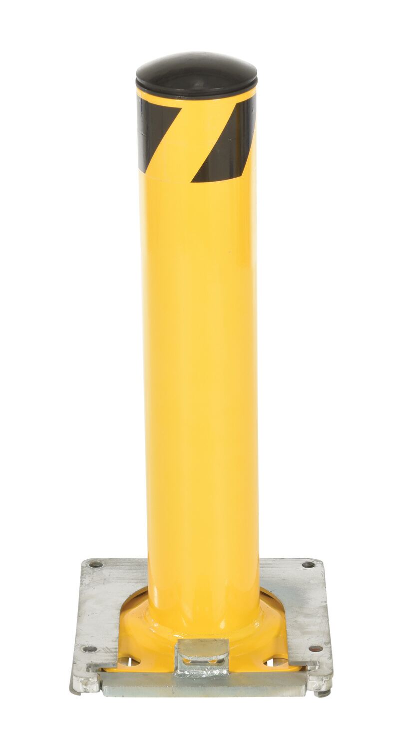 This steel pipe safety bollard can be used both indoors and outdoors to protect work areas, racking and personnel. Surface mounted steel base plate allows for quick and easy bollard removal. Steel base plate is bolted in place. Guard is easily inserted into base plate then locked in place. Base plate includes pre-drilled mounting holes. Plastic caps are removable. Powder coated safety yellow finish. Welded steel construction.