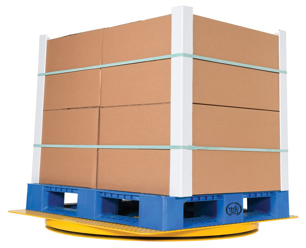 The heavy-duty king pin carousel has all the ergonomic benefits of the standard carousel with a top plate and stabilizing center pin. This carousel will handle a wider variety of loads and includes a heavy-duty maintenance free bearing. The king pin design allows off set loading up to fifty (50) percent of the capacity on at least fifty (50) percent of the deck. Standard top plates are square with rounded corners.