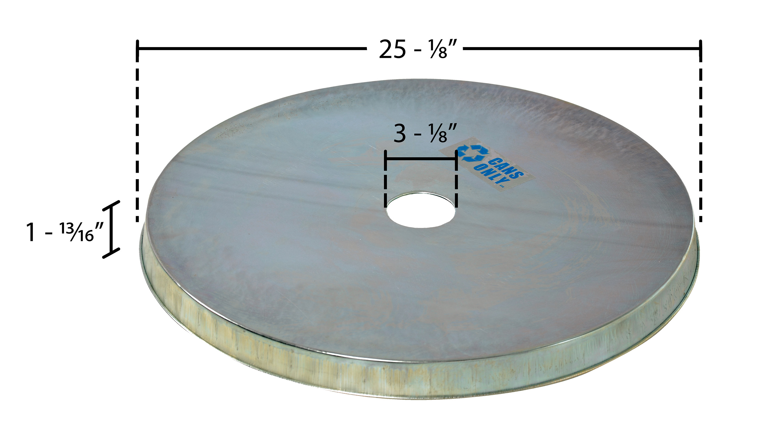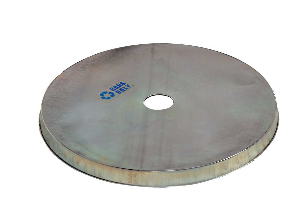 This Galvanized steel drum cover is for a fifty-five (55) gallon open head (tight head) drum. Manufactured from galvanized steel. Cover drum tops for added protection. Perimeter rim is beaded for safety. Recycling top includes a "cans only" decal.