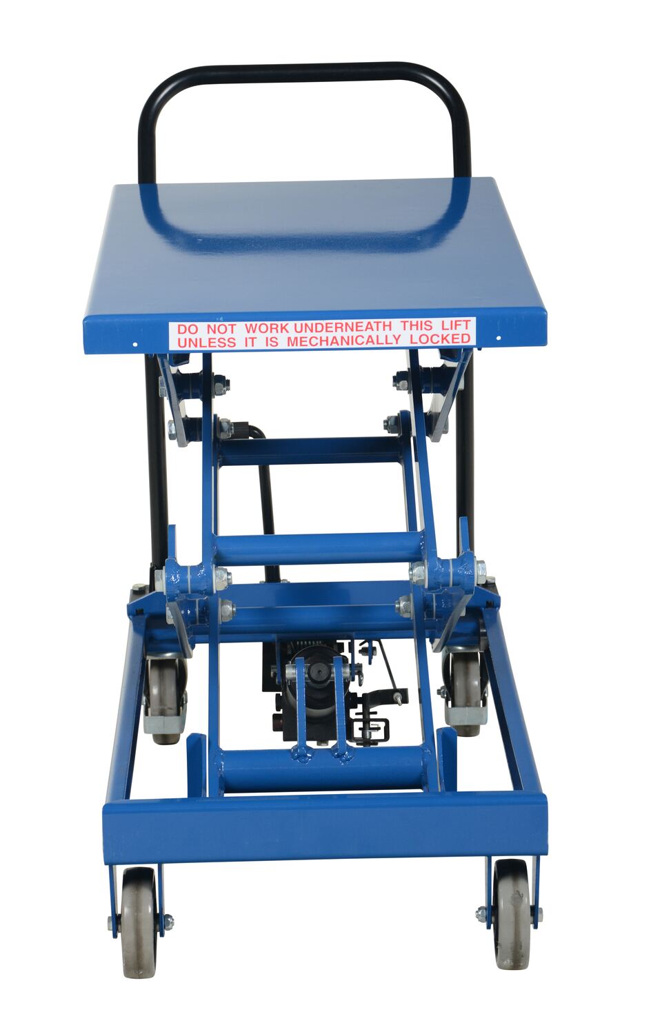 The premium scissor lift cart is constructed of heavy duty steel and designed to withstand the most demanding industrial environments. The simplicity and compactness of these products make them ideal for lifting and transporting loads, order-picking, die handling, and for use in support of assembly operations. There is little exertion required to raise and lower the deck due to the high quality foot-actuated, single speed hydraulic pump. The hydraulic system is equipped with an overload protection valve. Each cart has safety stops to prevent an empty deck from lowering while performing maintenance. A unique tilt-up table top allows for safe and easy maintenance. The two rigid front casters and two rear swivel polyurethane casters with brake provide a high degree of maneuverability; each swivel wheel is protected by guards and is equipped with brakes.