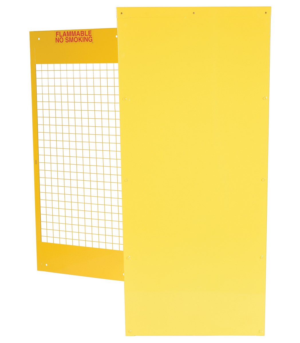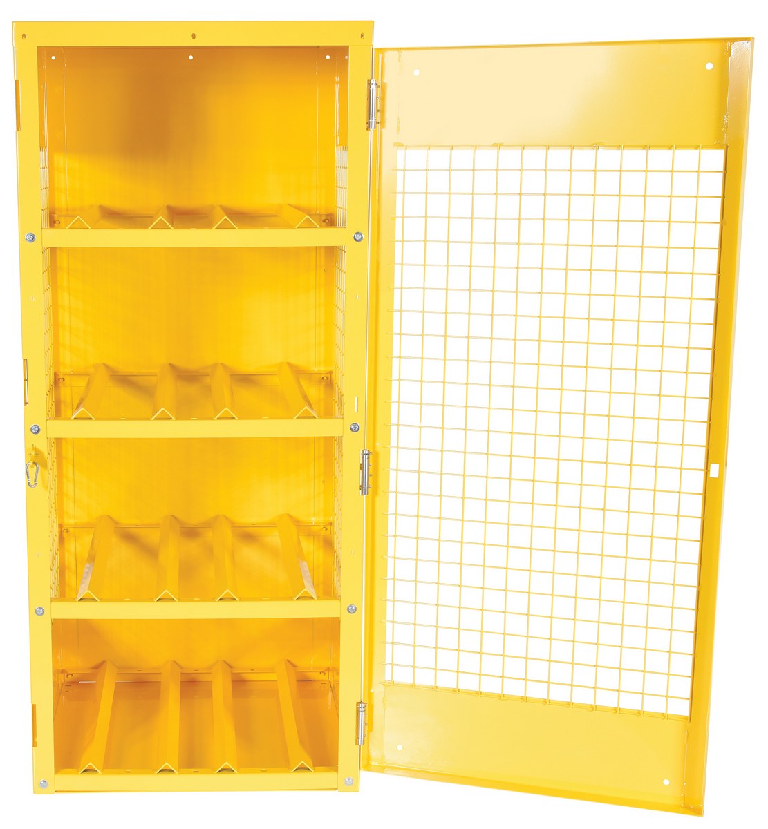 Steel cabinet for storage of cylinders. Cylinder storage capacity is based on cylinder size. Sides and door are made of expanded steel mesh. Bottom, back and top is made of solid sheet steel. Lockable doors protect cylinders (padlock not included). Base includes lag holes for securing cylinders. Rugged steel construction with safety yellow finish.