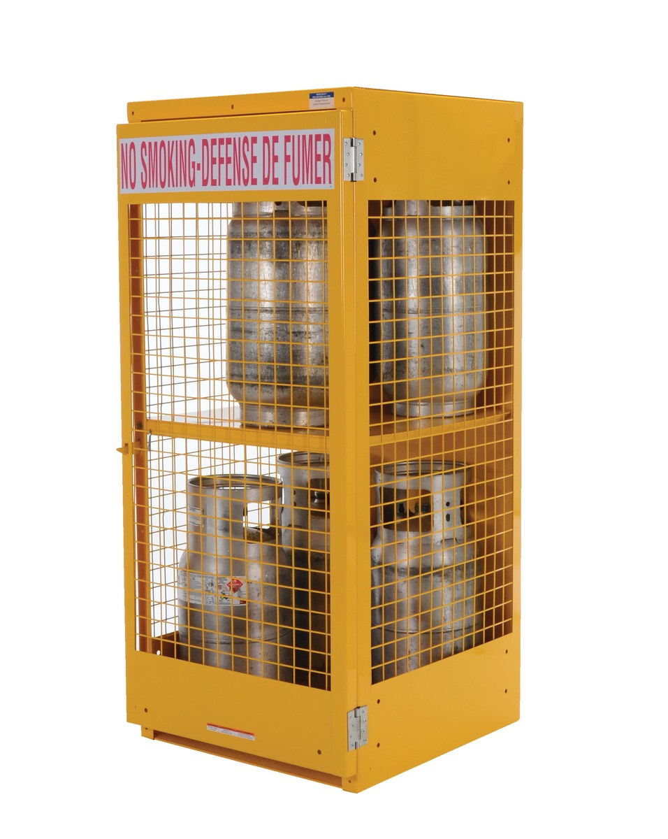 Durable steel cabinet for storage of LP style cylinders. Cylinder storage capacity is based on cylinder size. Sides and door are made of expanded steel mesh. Bottom, back and top are made of solid sheet steel. Lockable doors protect cylinders (padlock not included). Base includes lag holes for securing unit to floor (hardware is not included). Rugged welded steel construction with safety yellow finish. Cabinet ships fully assembled.