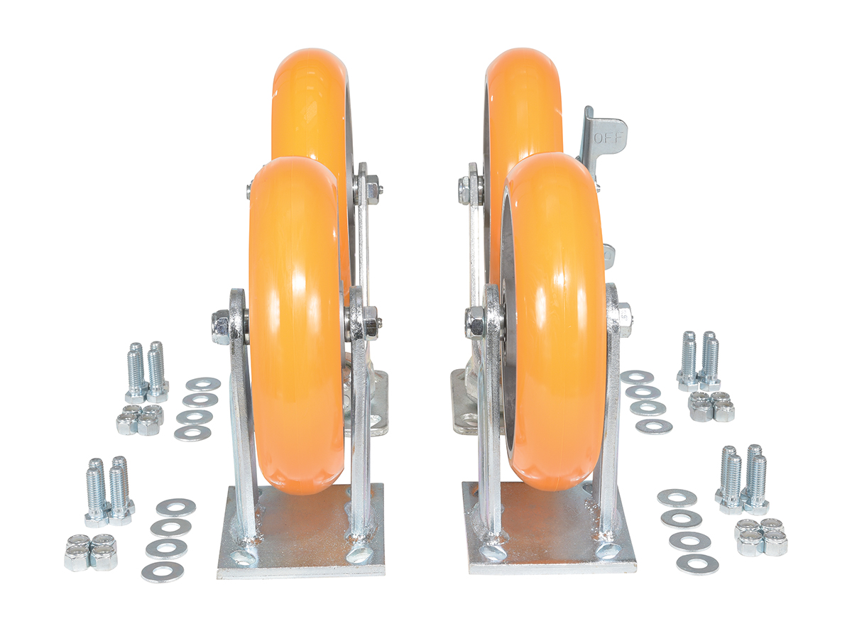Polyurethane Caster Kit 8 in x 2 in 6,000 Lb. Capacity ButterscotchConstructed of high-grade elastic Polyurethane and A robust Kingpinless rigging. Coupled with 6203 premium precision ball bearings for added strength and durability. The upgraded tread provides A longer life, reduces the force required for movement and offers exceptional floor preservation. 85 Shore A. wheel core is constructed of high-grade, light-weight, water resistant Aluminum. Made In Taiwan.