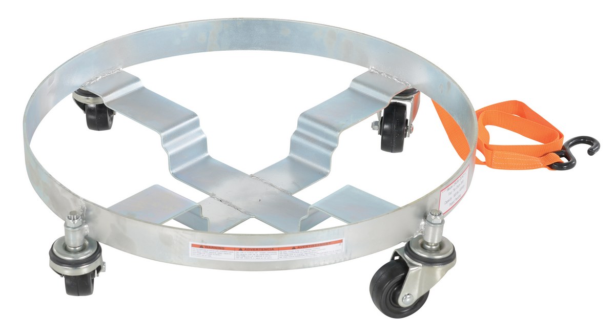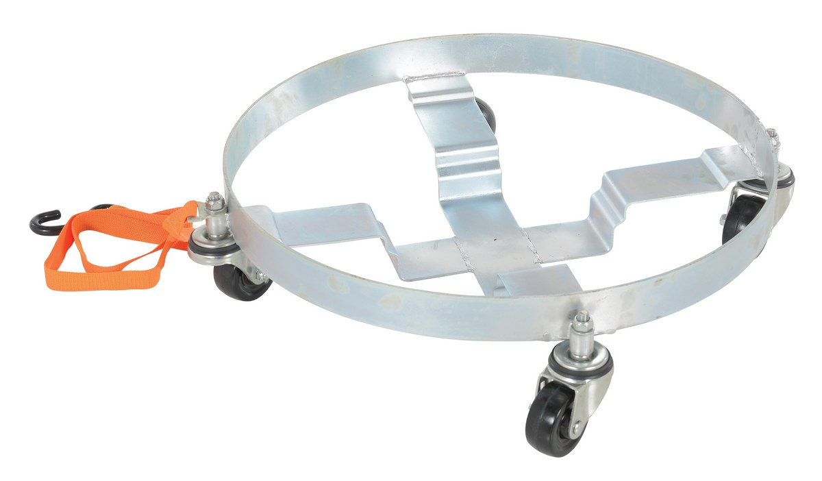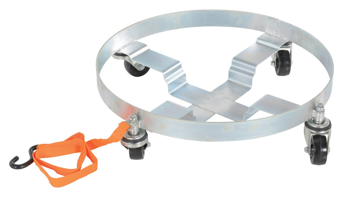 This multi-purpose quad drum dolly has a high polished bright zinc finish for corrosion resistance. The dolly comes with a nylon pull strap that helps in transporting down aisles or over thresholds. Rubber-coated hook allows strap to hook on top of drum for storage.
