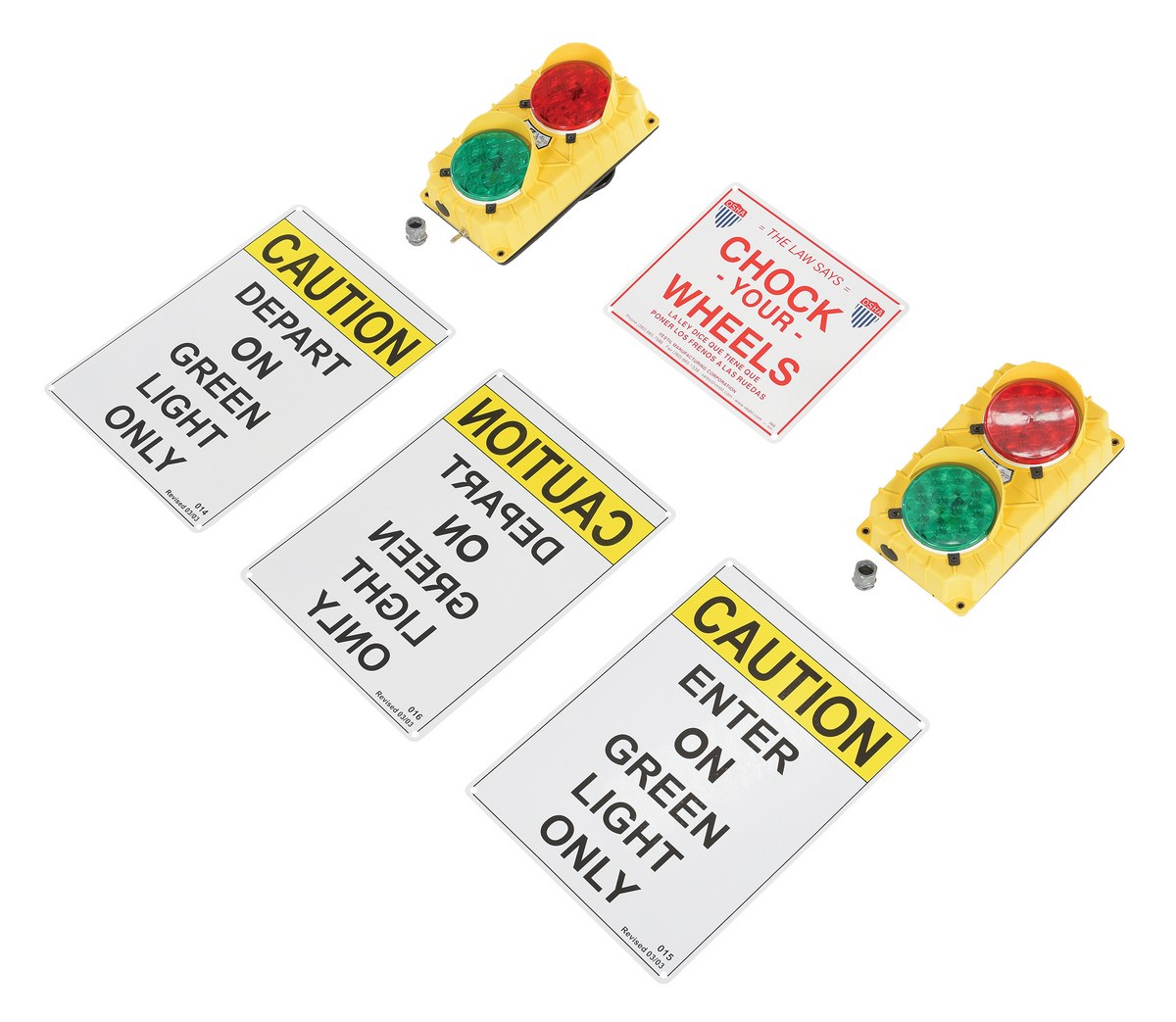 Our dock traffic systems feature flashing red and green lights. Prevent accidents and injuries by providing clear communication between dock personnel and truck drivers. Built-in eyebrow type sun visors increase light visibility. Economy, model DTS-5, comes with two (2) yellow polypropylene traffic lights, 6."W x 11."H, each having a green and a red lens. The light containing a push button is placed inside the dock area for the dock attendant, and the other is placed outside for the truck driver. Four (4) signs are included. LED model never needs bulb replacements.
