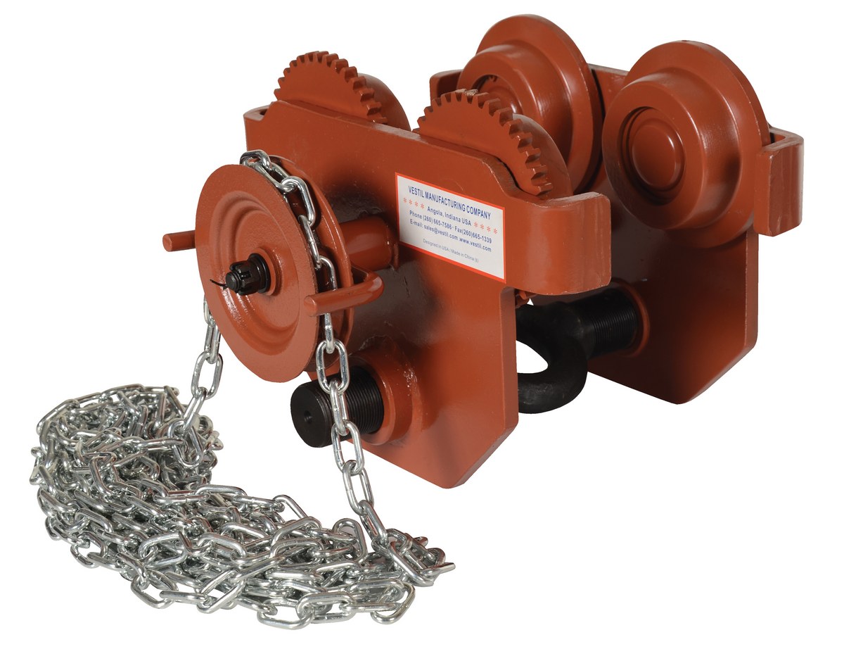 Steel Geared Eye Manual Trolley 6000 Lb. Capacity OrangeThis low profile manual trolley has been designed to quickly install on virtually any S, H, W and M type I-beam. The width of the trolley is adjusted by rotating the center rod with lifting eye clockwise or counterclockwise. Once the hoist (not included) is attached, the center rod cannot be rotated which prevents the trolley width from accidentally changing. This geared trolley is ideal for when precise positioning of the trolley is required. It includes four (4) rollers with sealed bearings for long life. A lifting eye is located at the bottom of the trolley for attaching a hoist (not included). The trolley features steel construction and a painted finish.