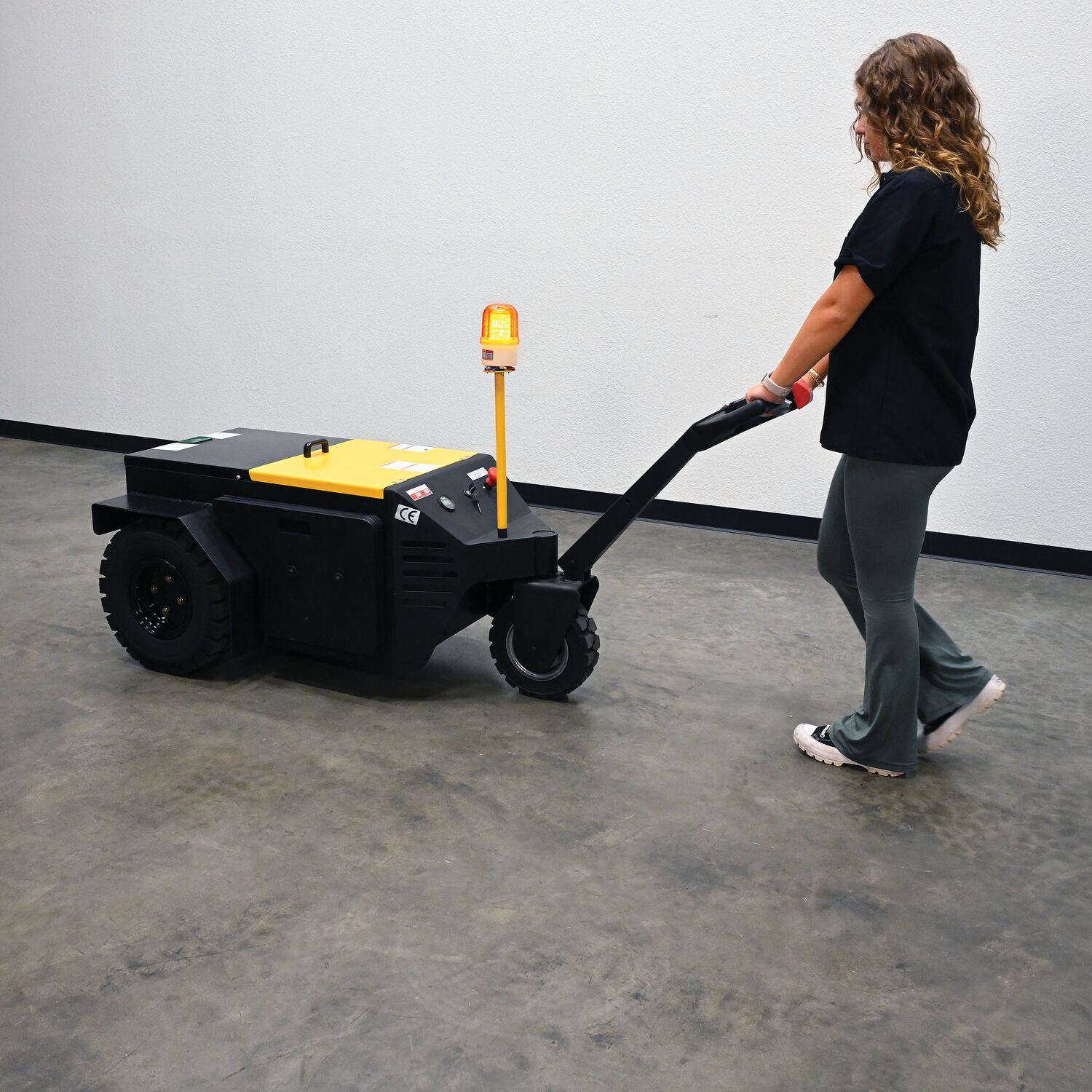 An electric powered heavy duty tugger is suitable for use in airports, hospitals. They can also be used in a variety of applications like pulling industrial carts, hoppers, and trailers; all without the needless extreme stress or strain on your body. Ergonomic handle features easy to operate throttle with forward/reverse speeds and horn. Also included is an electromagnetic disc brake with automatic dead-man feature that activates when the user releases the handle.