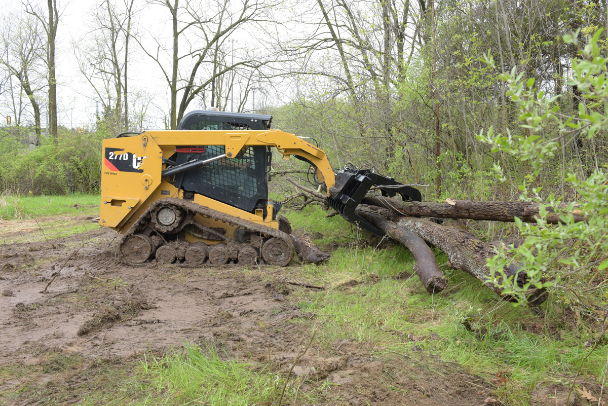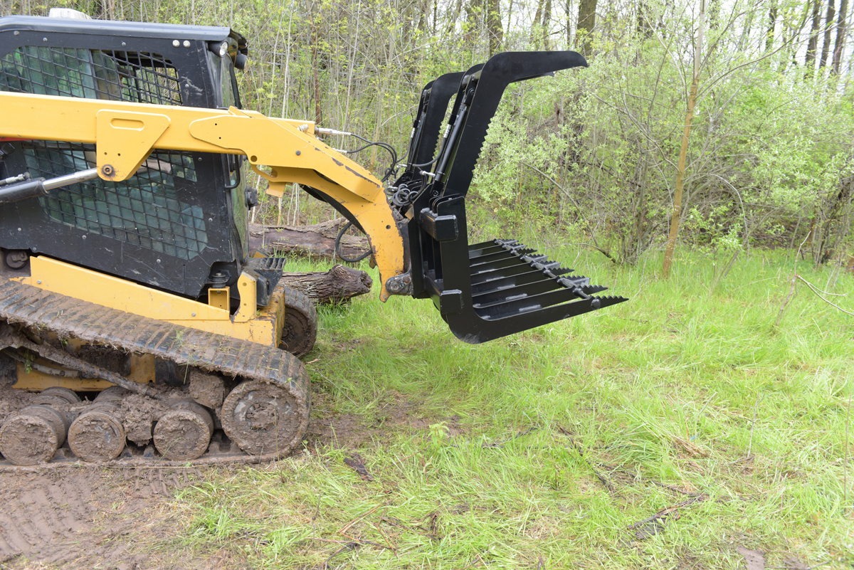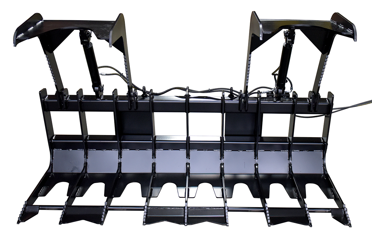 Steel Skid Steer Grab Bucket 84 In. Overall Width BlackA grapple bucket is a great tool for landscaping and other residential operations. With a simple attachment, the bucket can be in place and ready to use almost immediately. Constructed of steel, the grapple bucket shows long lasting strength throughout use. With the help of the leading edge and two over the top arms, this unit is perfectly designed for clearing brush and overgrown shrubbery. The open grate style bottom allows debris and other loose material to fall through, leaving only the intended objects in the bucket.